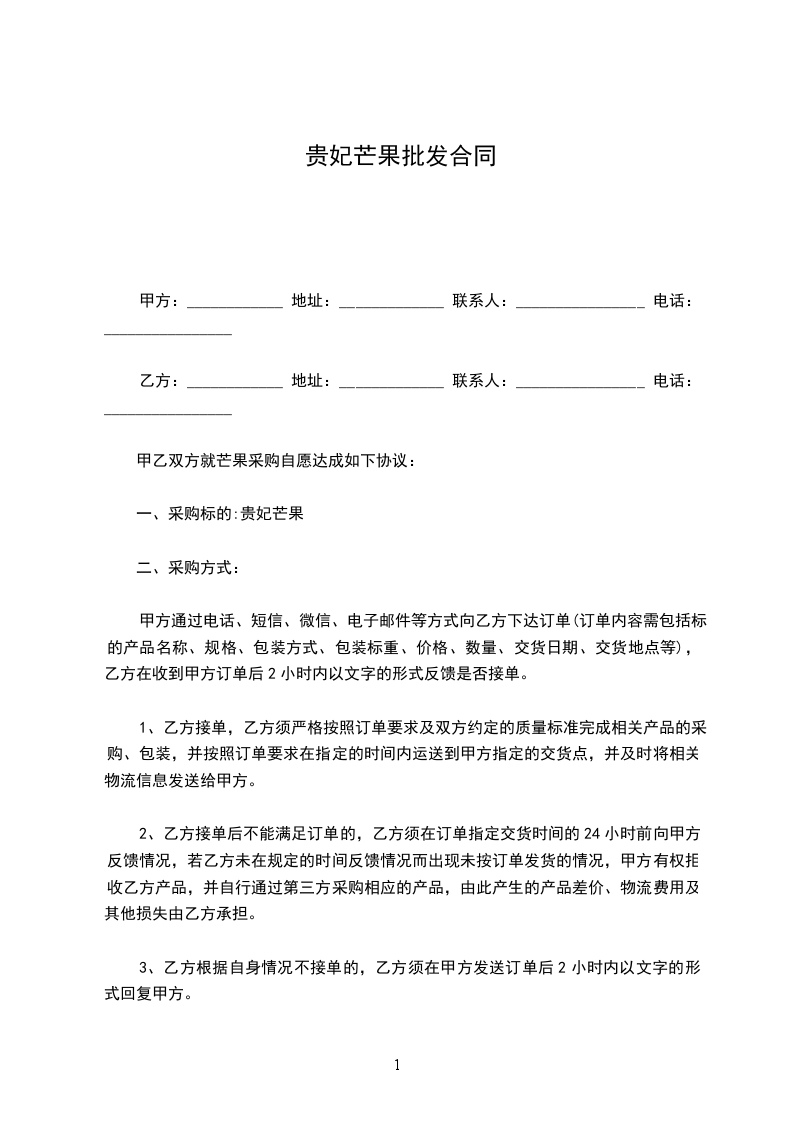 1、甲方向乙方预付芒果采购货款 ________ 元人民币 (大写:___________ ),芒果成熟后甲方按双方商定的价格收购乙方的产品,并从货款里扣除预付款。