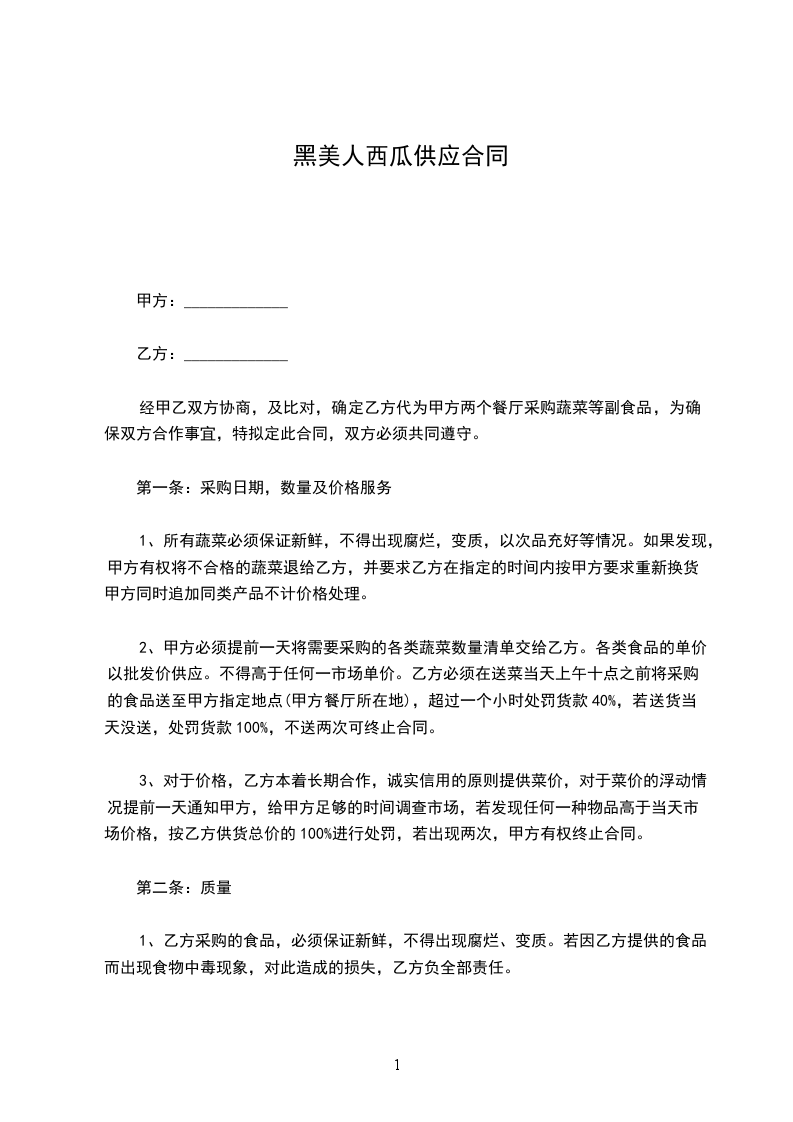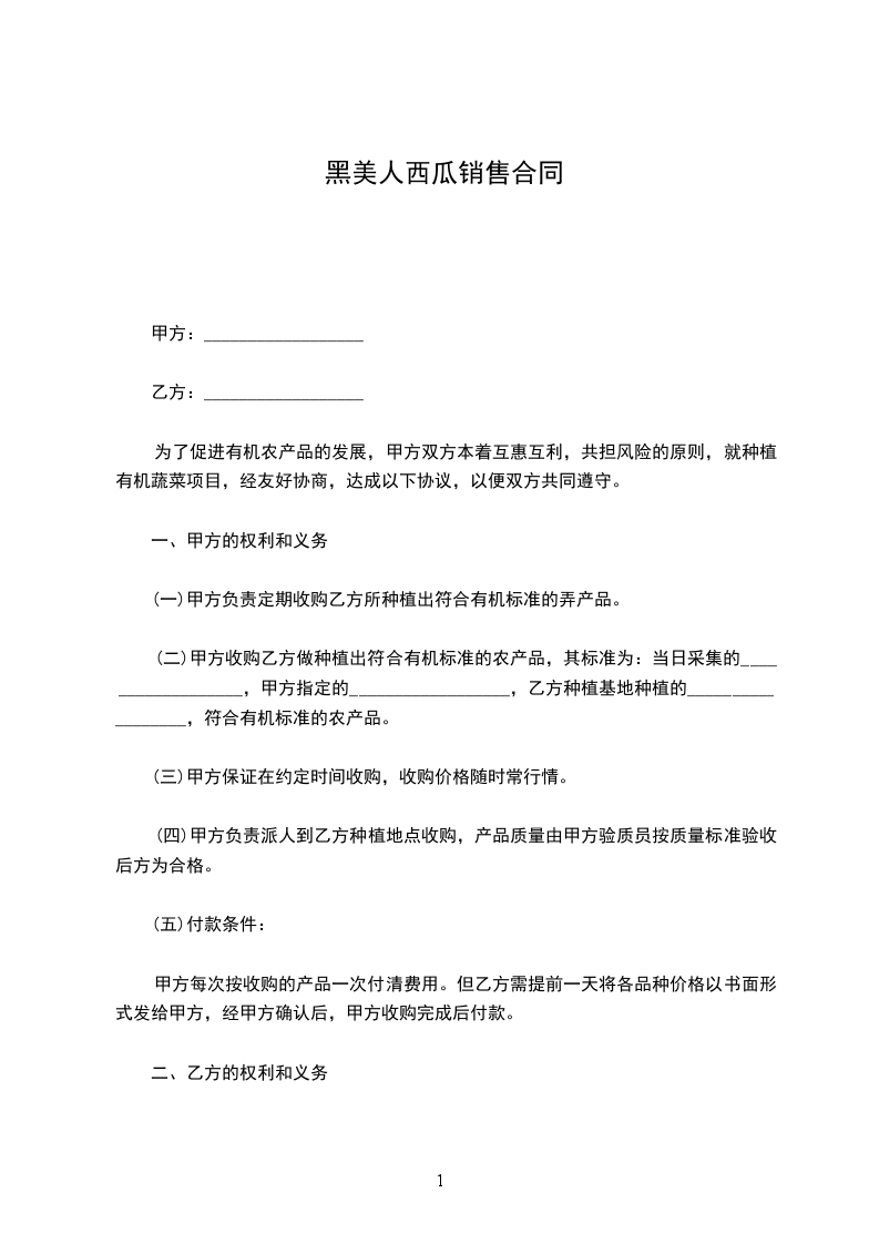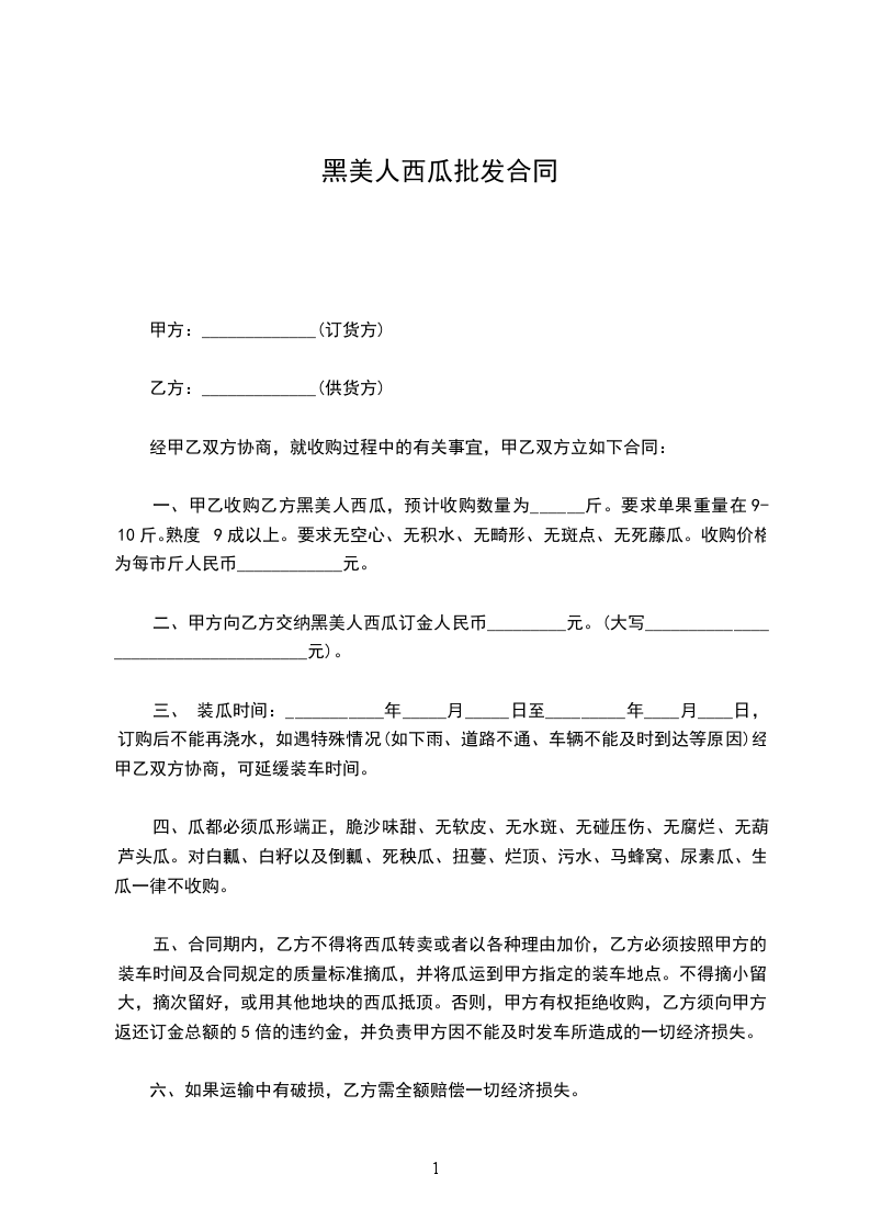 一、甲乙收购乙方黑美人西瓜,预计收购数量为______斤。要求单果重量在9-10斤。熟度9成以上。要求无空心、无积水、无畸形、无斑点、无死藤瓜。收购价格为每市斤人民币____________元。