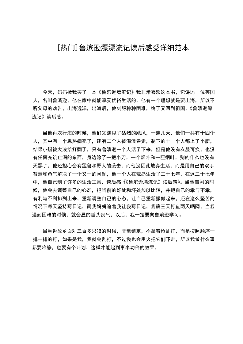 当他再次行海的时候,他们又遇见了猛烈的飓风,一连几天,他们一共有十四个人,其中有一个患热病死了,还有二个人被海浪卷走,剩下的十一个人都上了小艇,结果小艇被大浪给打翻了,只有鲁滨逊一个人活了下来,但是他没有衣服可换,也没有任何充饥止渴的东西,身边除了一把小刀,一个烟斗和一匣烟叶,别的什么也没有,天黑了,他还担心会有猛兽和野人的袭击,而他没因此放弃生活,而是用自己的双手,智慧和恿气解决了一个又一的问题,他一个人在荒岛生活了二十七年,在这二十七年中,他自己制了许多的生活工具,读后感《《鲁滨逊漂流记》读后感》。当他苦闷的时候,他会去调整自己的心态,把当前的好处和坏处加以比较,并把自己的幸与不幸,有利与不利排列出来,重新调整自己的心态,让自己重新振做起来,还在这么坚苦的情况下每天坚持写日记,而我妈妈追着我让我写日记,我确三天打鱼两天晒网,当我遇到困难的时候,就会显的垂头丧气,以后,我一定要向鲁滨逊学习。