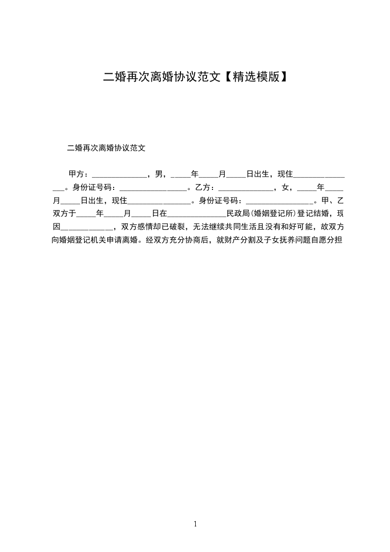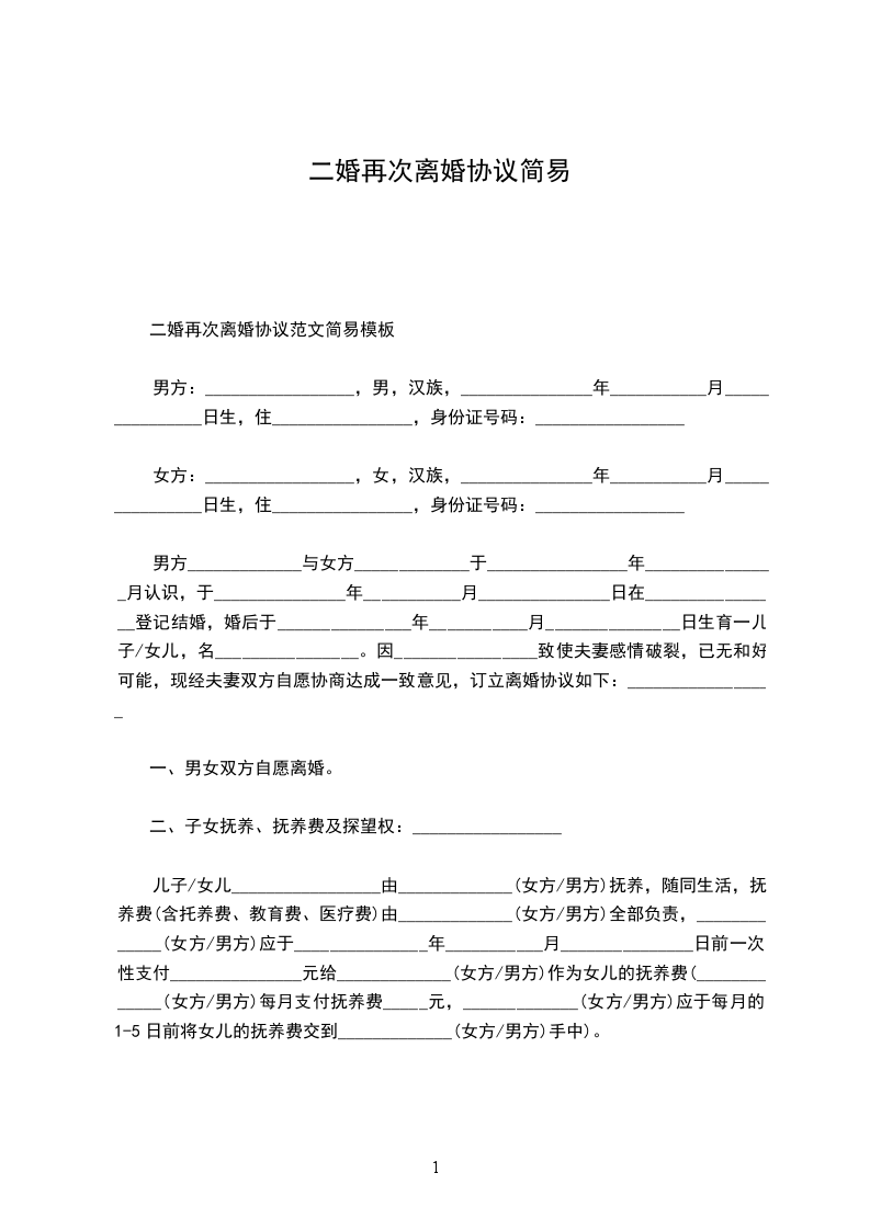 甲方:______________,男,_____年_____月_____日出生,现住________________。身份证号码:_________________。乙方:______________,女,_____年_____月_____日出生,现住________________。身份证号码:_________________。甲、乙双方于_____年_____月_____日在_______________民政局(婚姻登记所)登记结婚,现因_____________,双方感情却已破裂,无法继续共同生活且没有和好可能,故双方向婚姻登记机关申请离婚。经双方充分协商后,就财产分割及子女抚养问题自愿分担。