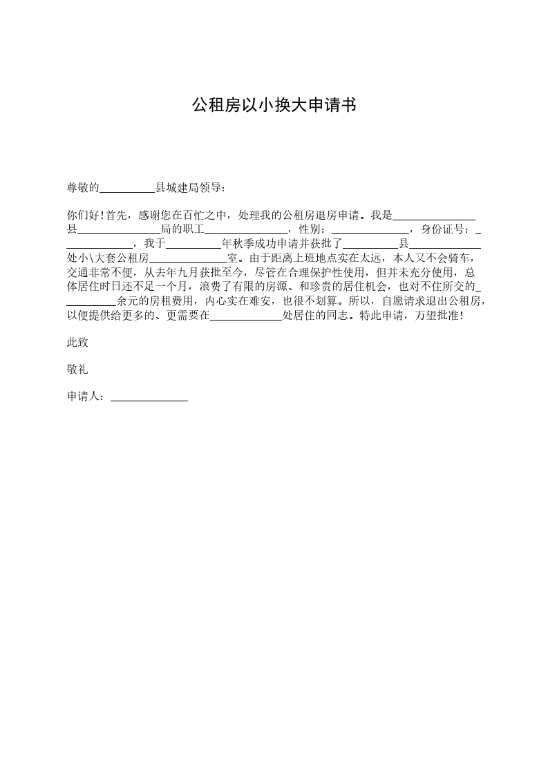 尊敬的__________县城建局领导:你们好!首先,感谢您在百忙之中,处理我的公租房退房申请。我是_______________县_______________局的职工_______________,性别:______________,身份证号:_____________,我于__________年秋季成功申请并获批了__________县_____________处小\大套公租房______________室。由于距离上班地点实在太远,本人又不会骑车,交通非常不便,从去年九月获批至今,尽管在合理保护性使用,但并未充分使用,总体居住时日还不足一个月,浪费了有限的房源、和珍贵的居住机会,也对不住所交的__________余元的房租费用,内心实在难安,也很不划算。所以,自愿请求退出公租房,以便提供给更多的、更需要在_____________处居住的同志。特此申请,万望批准!此致敬礼申请人:______________