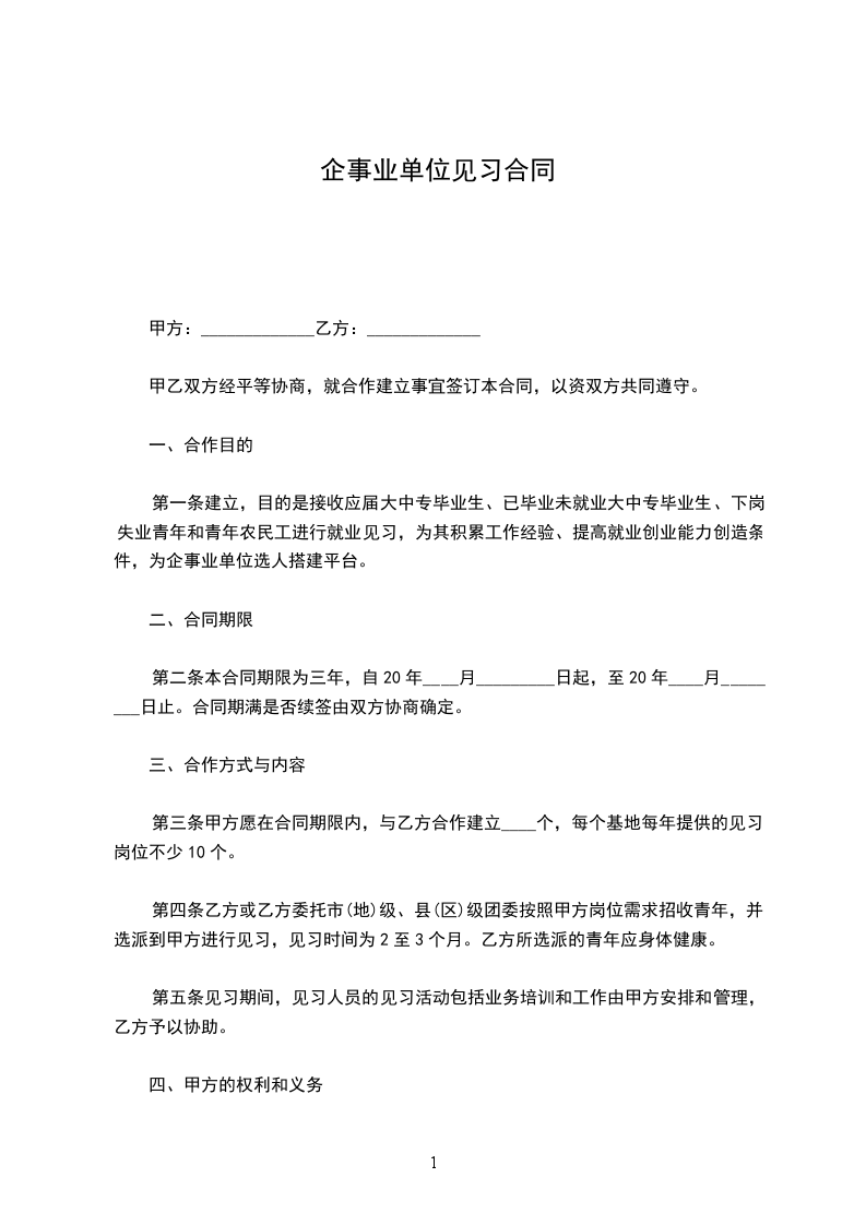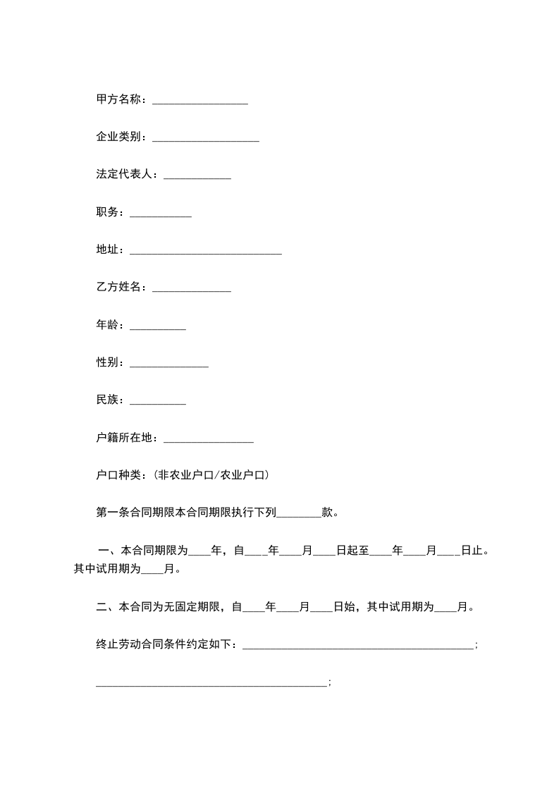 (一)本合同期限为 年,自 年 月 日至 年 月 日止。试用期为 个月,自 年 月 日至 年 月 日止。