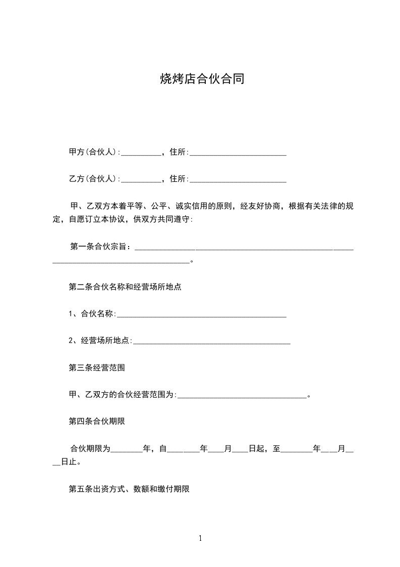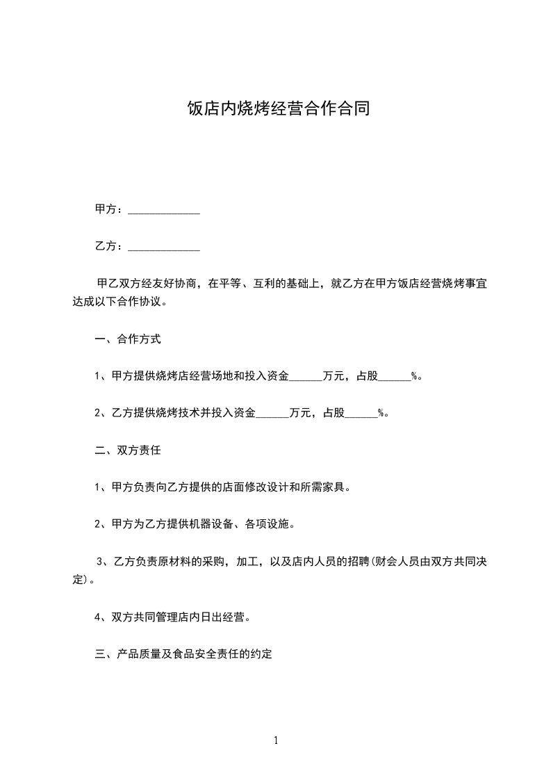 1、甲方提供烧烤店经营场地和投入资金______万元,占股______%。