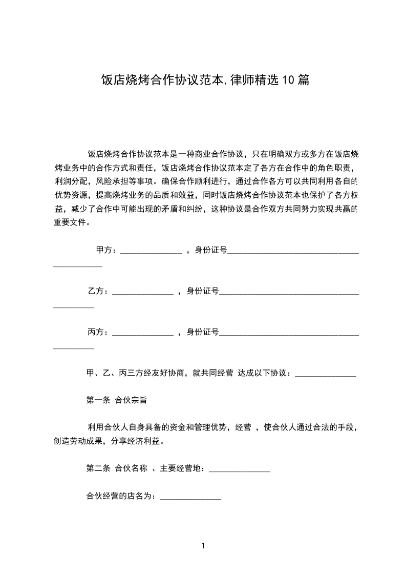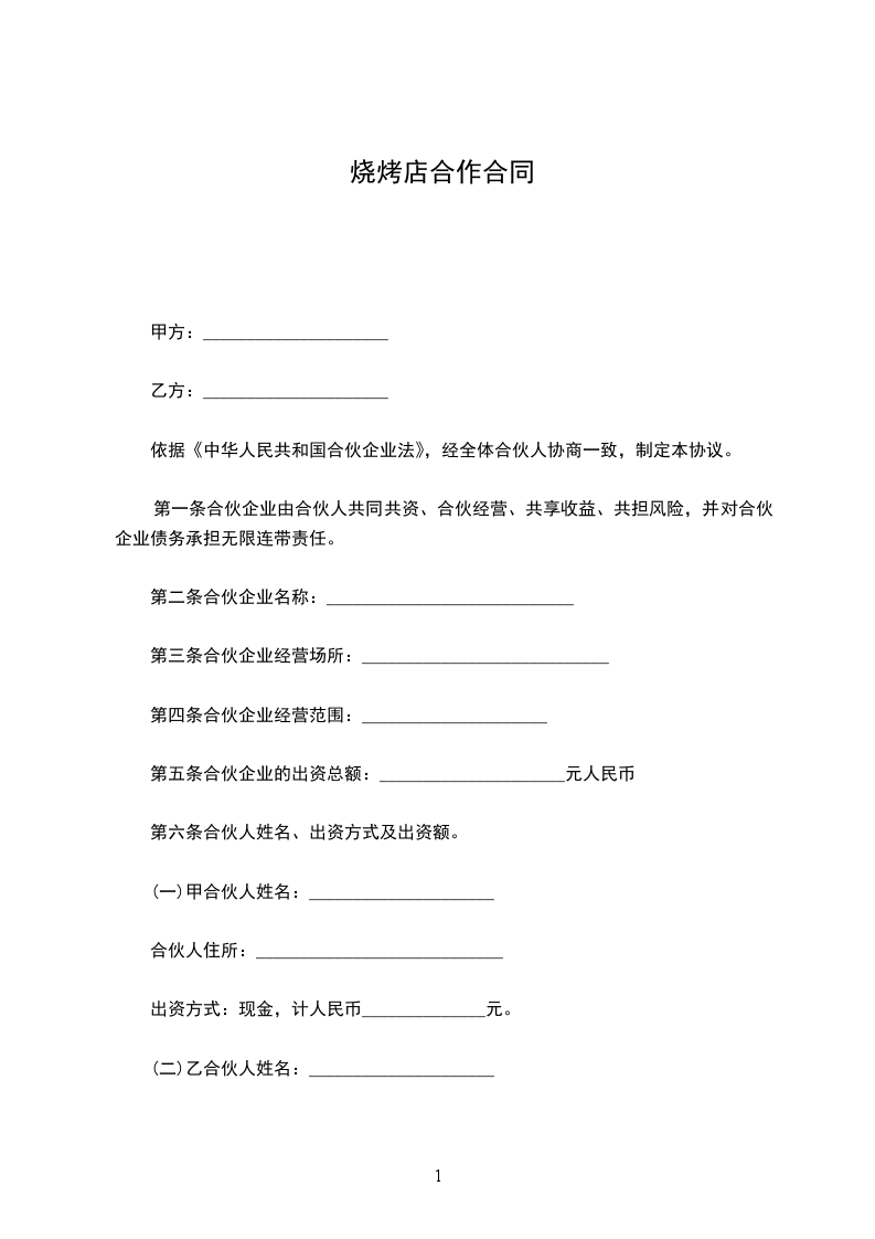 饭店烧烤合作协议范本