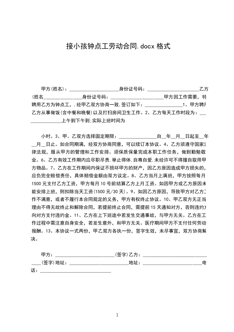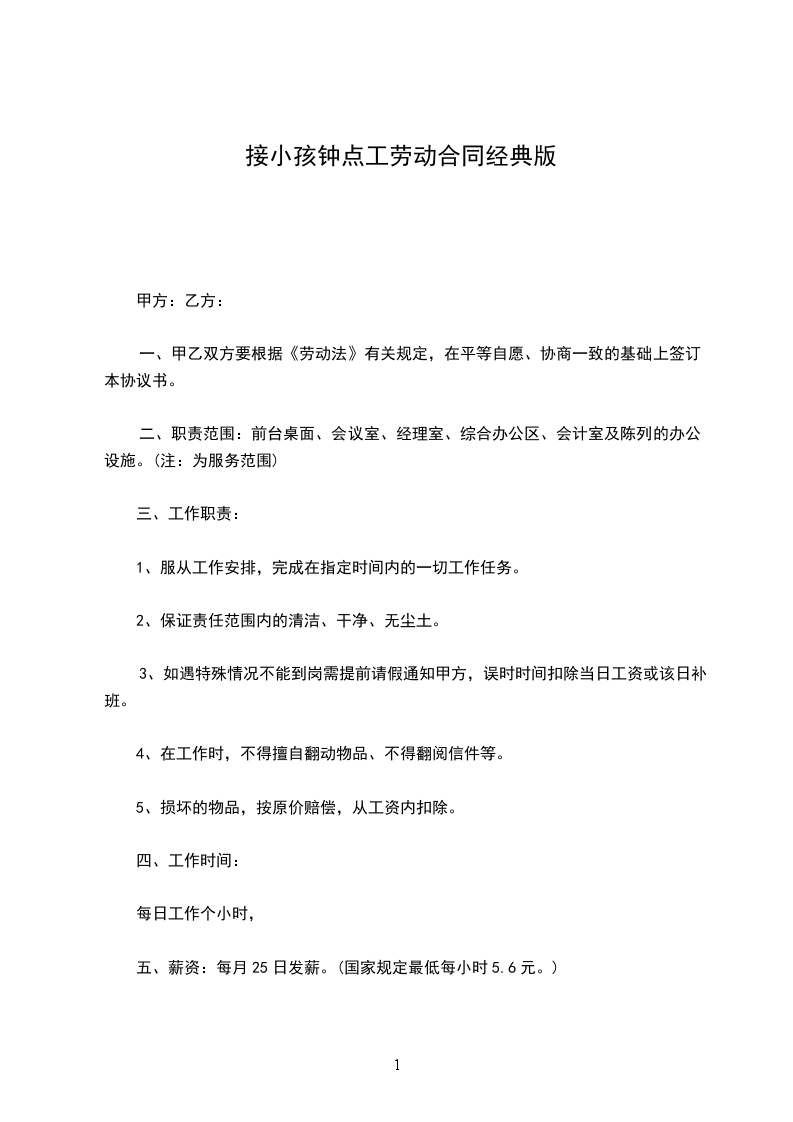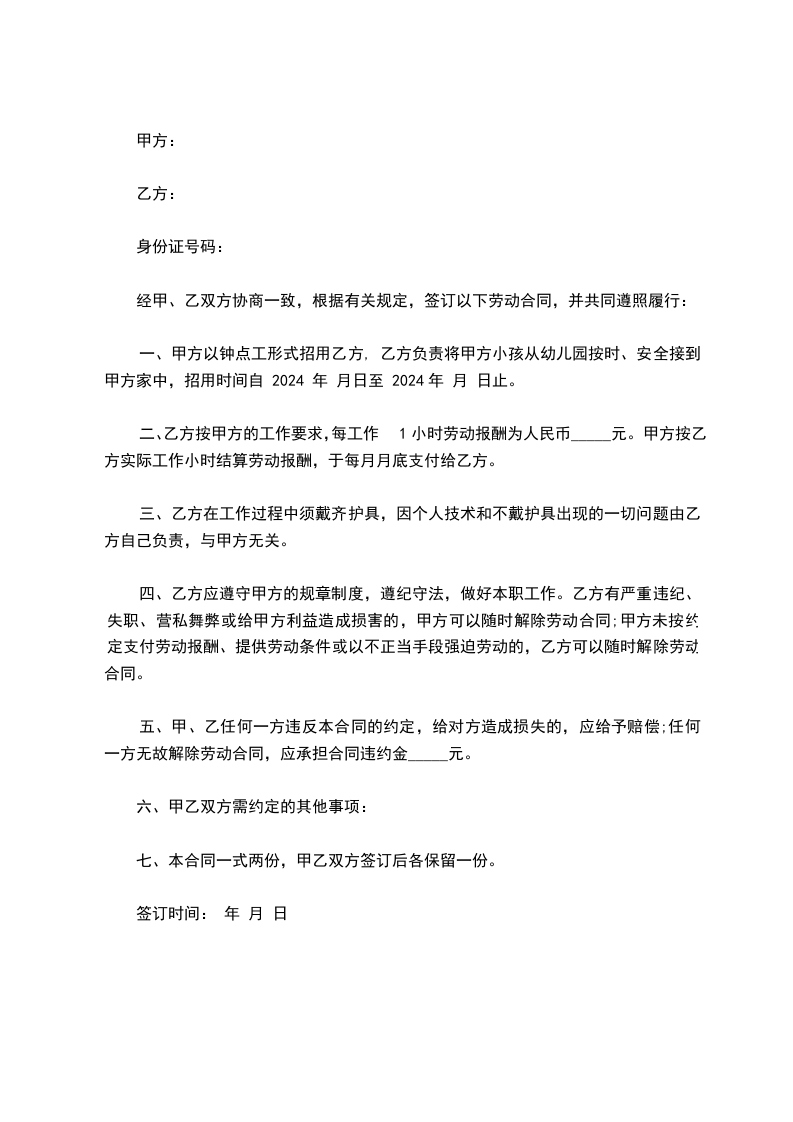 一、甲方以钟点工形式招用乙方, 乙方负责将甲方小孩从幼儿园按时、安全接到甲方家中,招用时间自 2024 年 月日至 2024年 月 日止。