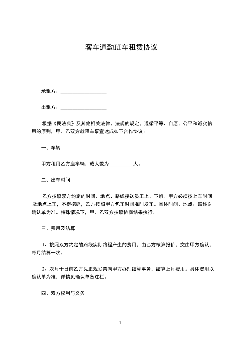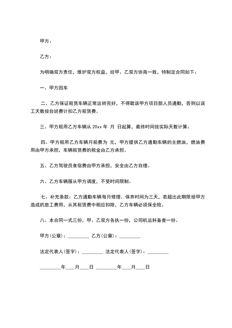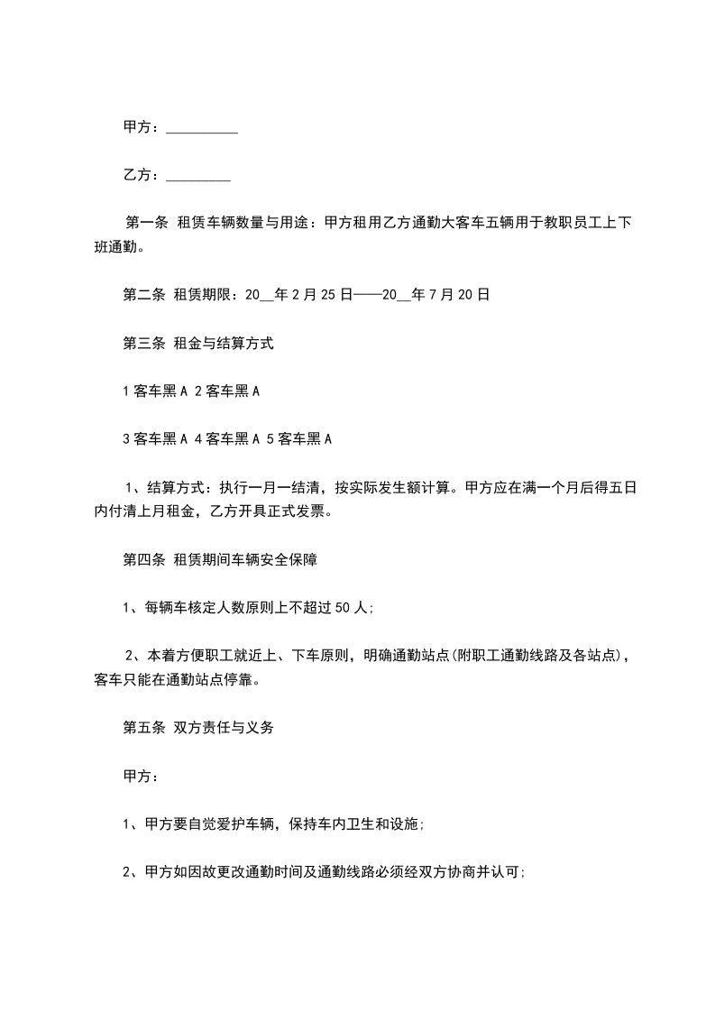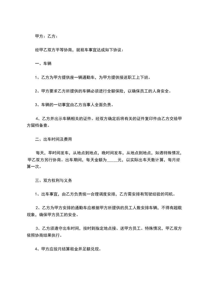 每天,早时间发车,从地点到地点,晚时间发车,从地点到地点,如遇特殊情况,甲乙双方另行协商。出车期间,每天金额为元,以实际出车天数计算,每月结算一次。