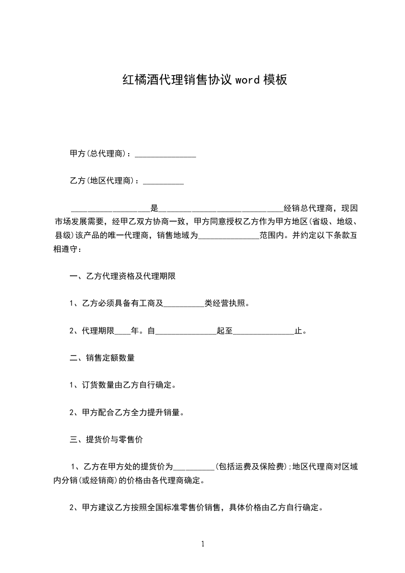 _____________________是澳洲葡萄酒讴布特(讴布特嘉本纳干红OlddbuttCabernetSauvignon)中国地区红酒经销总代理商,现因市场发展需要,经甲乙双方协商一致,甲方同意授权乙方作为甲方地区(省级、地级、县级)该产品的唯一代理商,销售地域为范围内。并约定以下条款互相遵守: