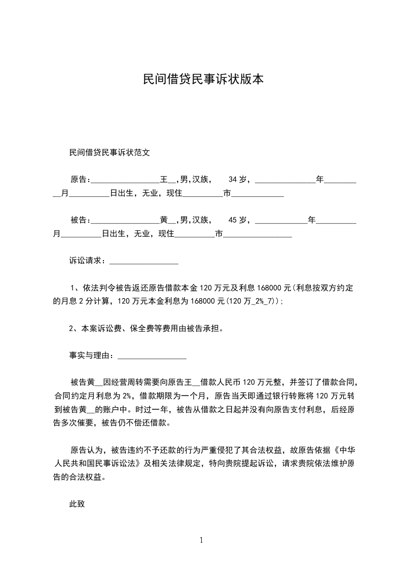 民间借贷民事诉状范文