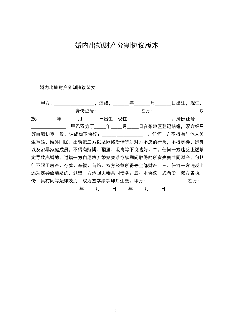 甲方:_________________,汉族,_______年_______月_______日出生,现住:_________________,身份证号:_________________;乙方:_________________,汉族,_______年_______月_______日出生,现住:_________________,身份证号:_________________。甲乙双方于_____年_____月_____日在某地区登记结婚,双方经平等自愿协商一致,达成如下协议:_________________一、任何一方不得有与他人发生重婚、婚外同居、出轨第三方以及网络爱情等对对方不忠的行为,不得虐待、遗弃以及家暴家庭成员,不得有赌博、酗酒、吸毒等不良嗜好。二、任何一方违反上述规定导致离婚的,过错一方自愿放弃婚姻关系存续期间取得的所有夫妻共同财产,包括但不限于房产、存款、车辆、首饰、双方经营所得等全部财产。三、任何一方违反上述规定导致离婚的,过错一方承担夫妻共同债务。五、本协议一式两份,双方各执一份,具有同等法律效力,双方签字按手印后生效。甲方:_________________乙方:______________________年_____月_____日_____年_____月_____日