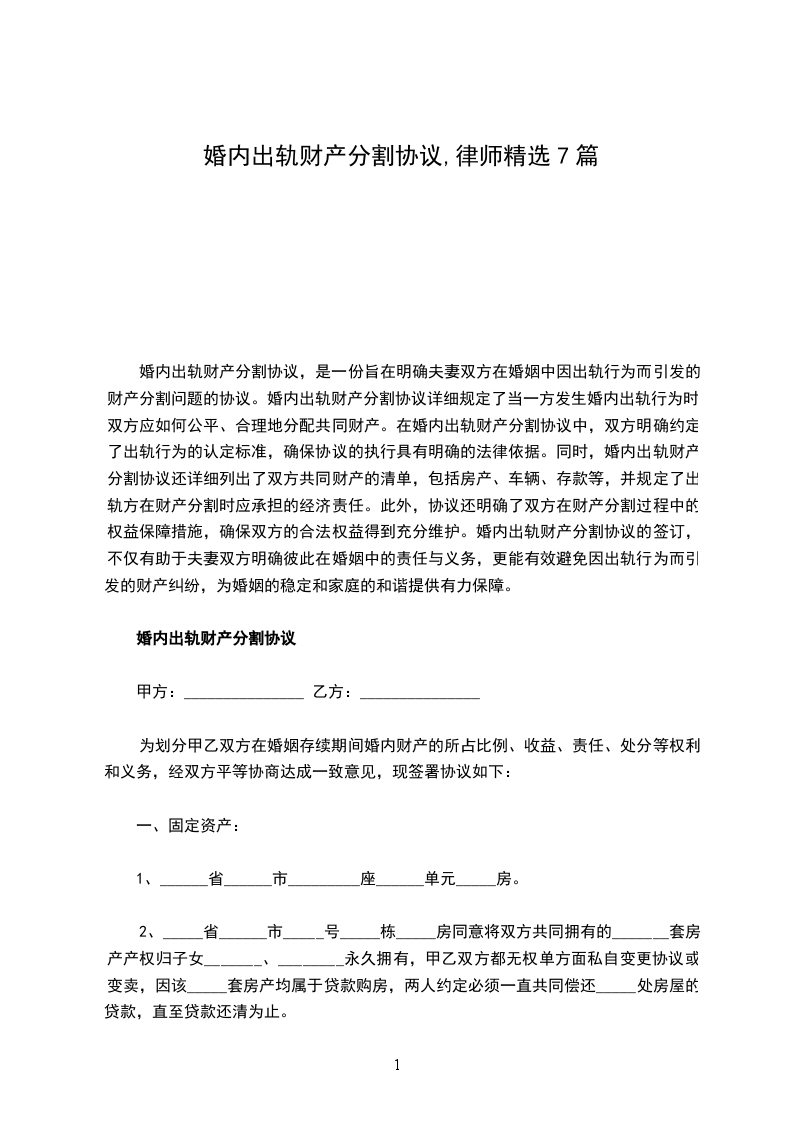 婚内出轨财产分割协议范文