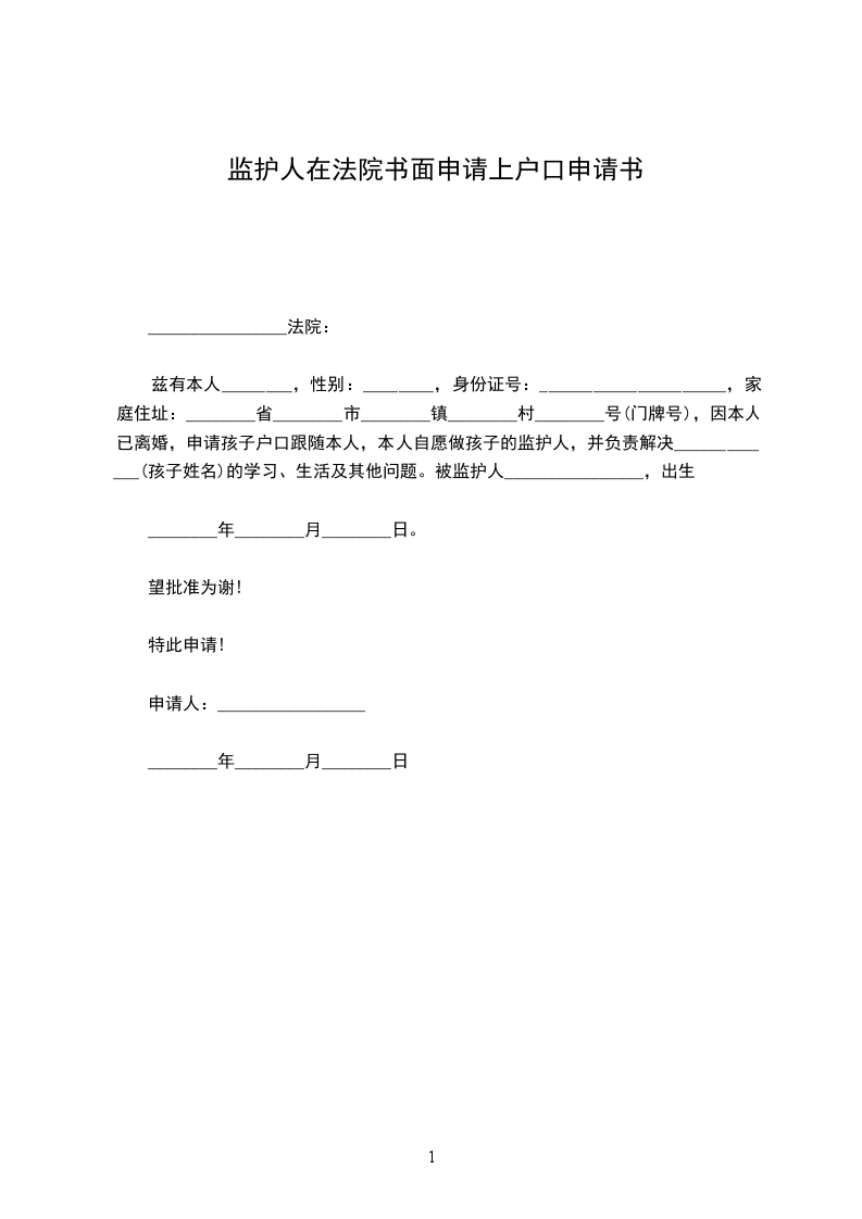 监护人书面申请上户口范本