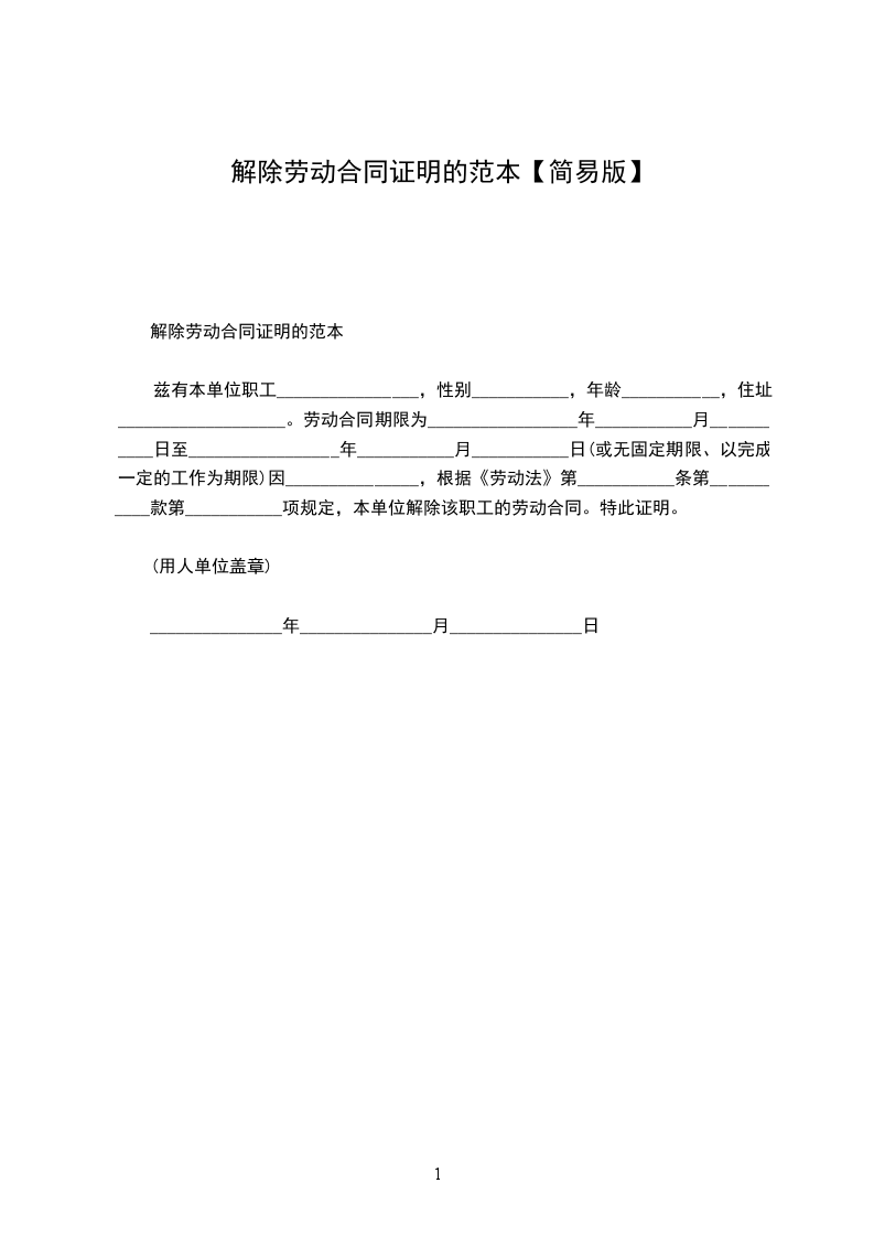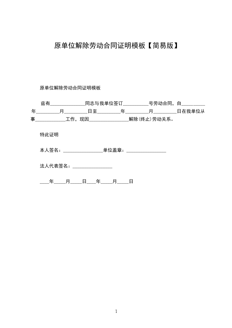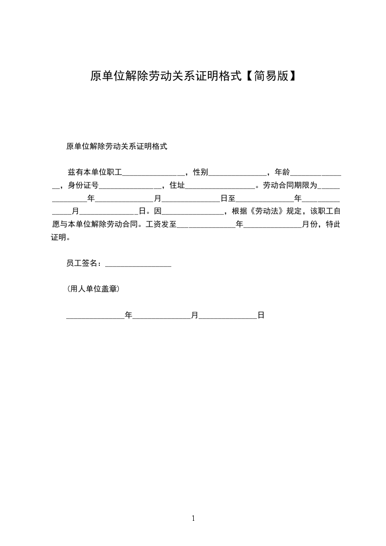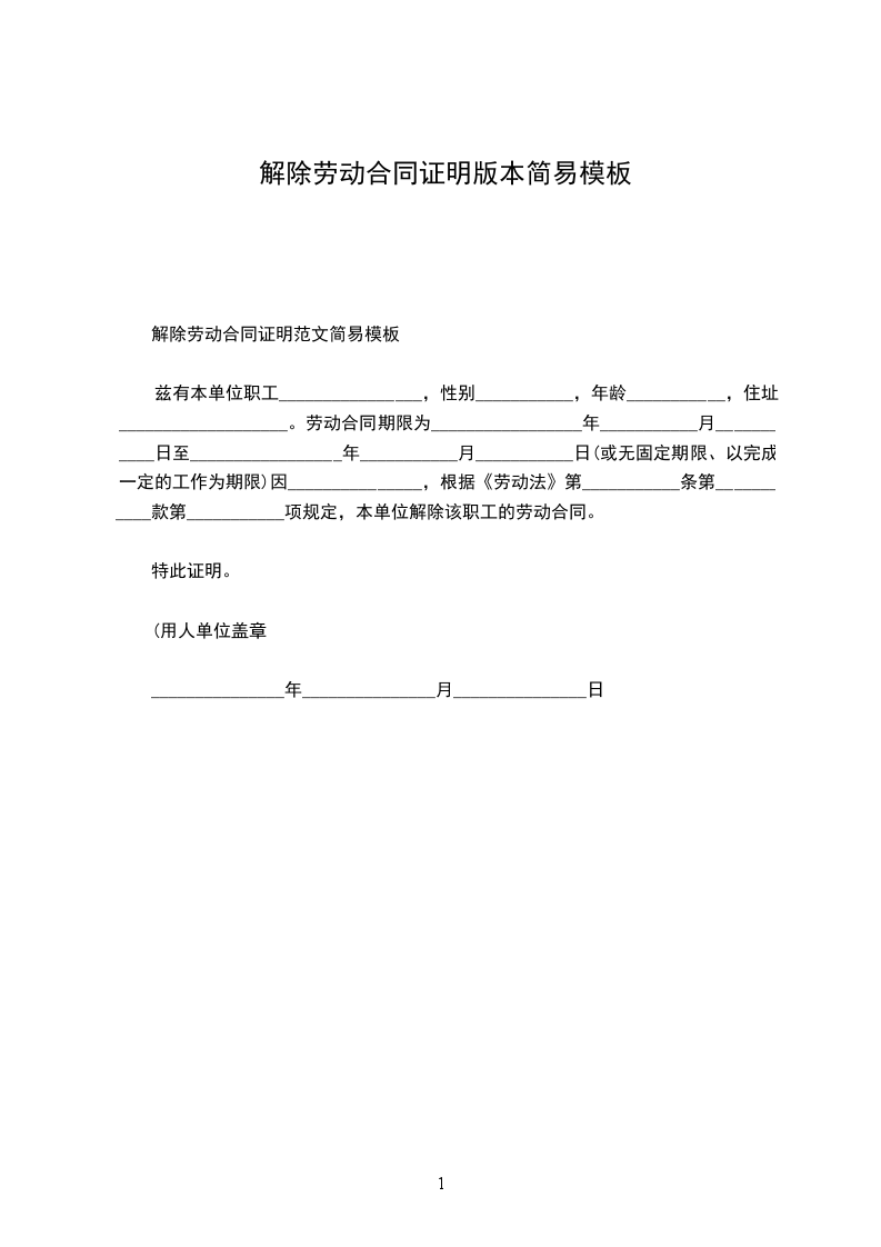 个人解除劳动合同证明范本