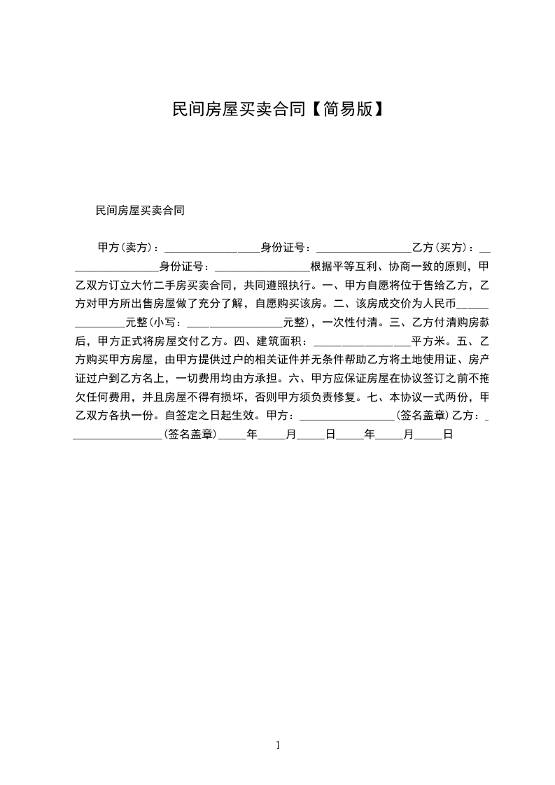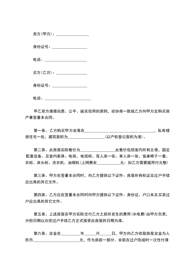 甲方(卖方):_________________身份证号:_________________乙方(买方):_________________身份证号:_________________根据平等互利、协商一致的原则,甲、乙双方订立大竹二手房买卖合同,共同遵照执行。一、甲方自愿将位于售给乙方,乙方对甲方所出售房屋做了充分了解,自愿购买该房。二、该房成交价为人民币_______________元整(小写:_________________元整),一次性付清。三、乙方付清购房款后,甲方正式将房屋交付乙方。四、建筑面积:_________________平方米。五、乙方购买甲方房屋,由甲方提供过户的相关证件并无条件帮助乙方将土地使用证、房产证过户到乙方名上,一切费用均由方承担。六、甲方应保证房屋在协议签订之前不拖欠任何费用,并且房屋不得有损坏,否则甲方须负责修复。七、本协议一式两份,甲乙双方各执一份。自签定之日起生效。甲方:_________________(签名盖章)乙方:_________________(签名盖章)_____年_____月_____日_____年_____月_____日