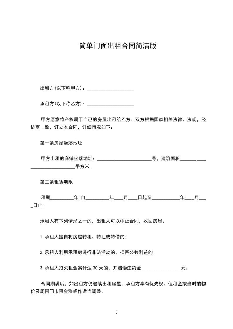 1、甲方将门面租给乙方,_____年_____月_____日至日止,月租金为