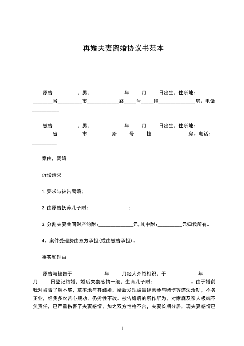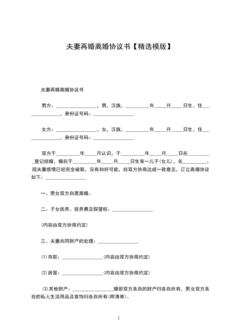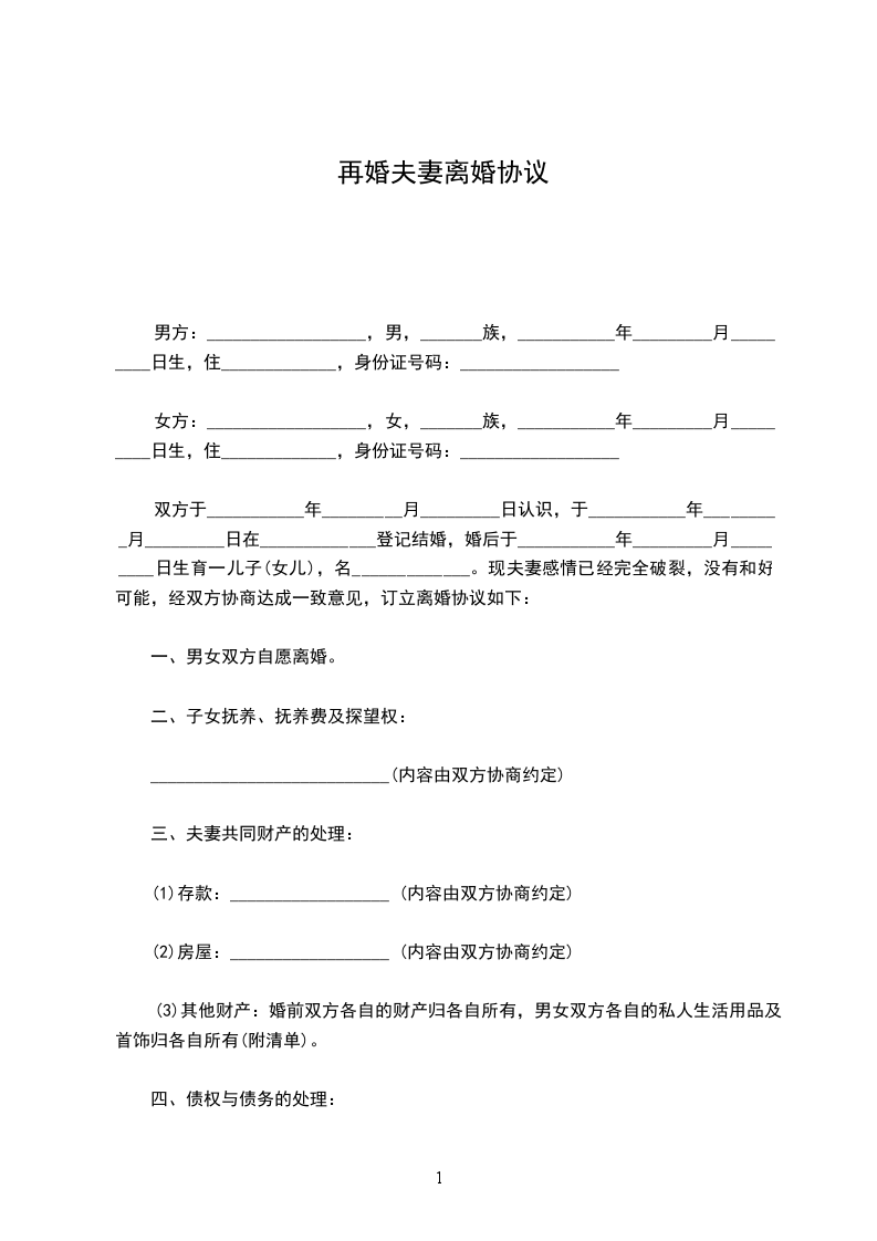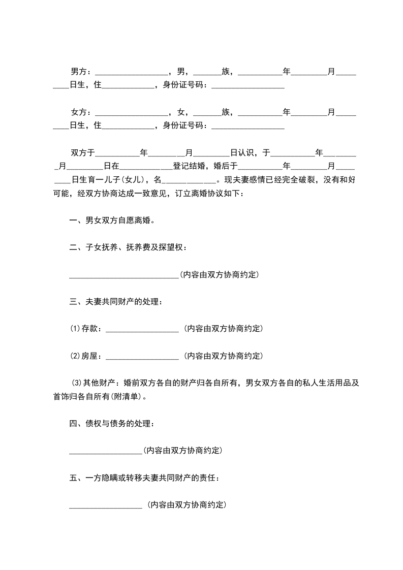 双方于__________年_____月认识,于__________年_____月_____日在__________登记结婚,婚后于__________年_____月_____日生育一儿子(女儿),名__________。现夫妻感情已经完全破裂,没有和好可能,经双方协商达成一致意见,订立离婚协议如下:_________________