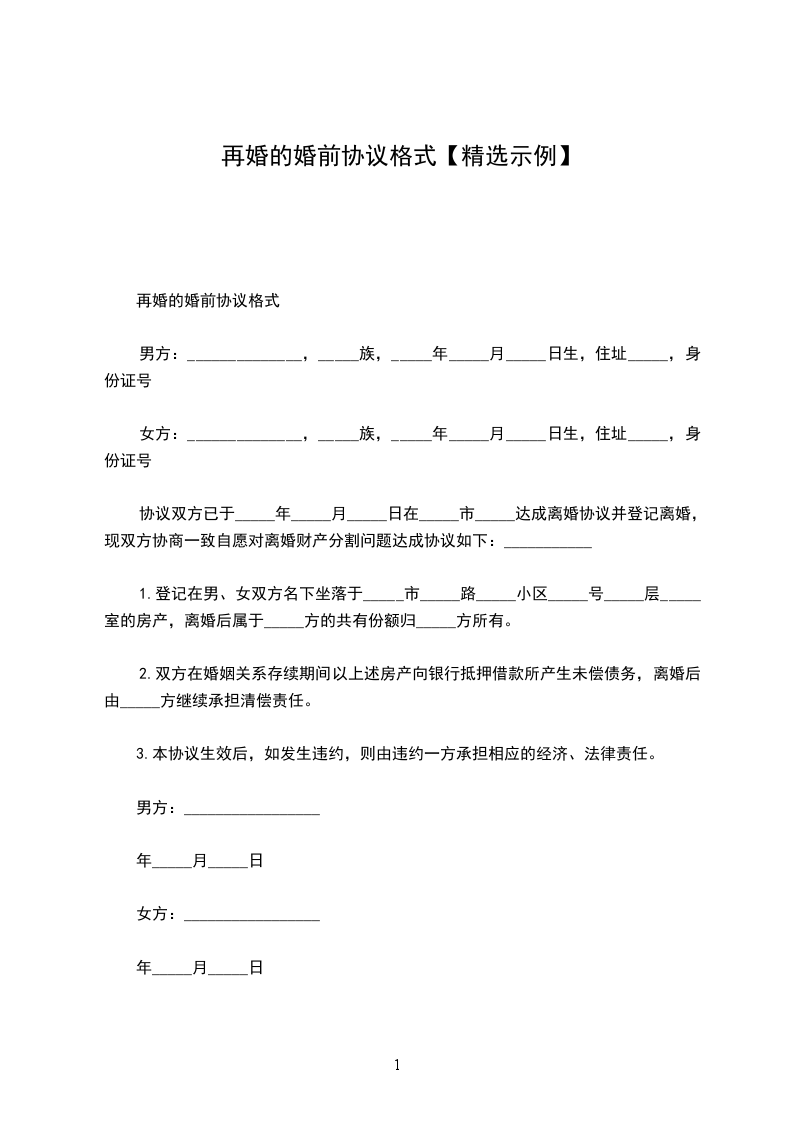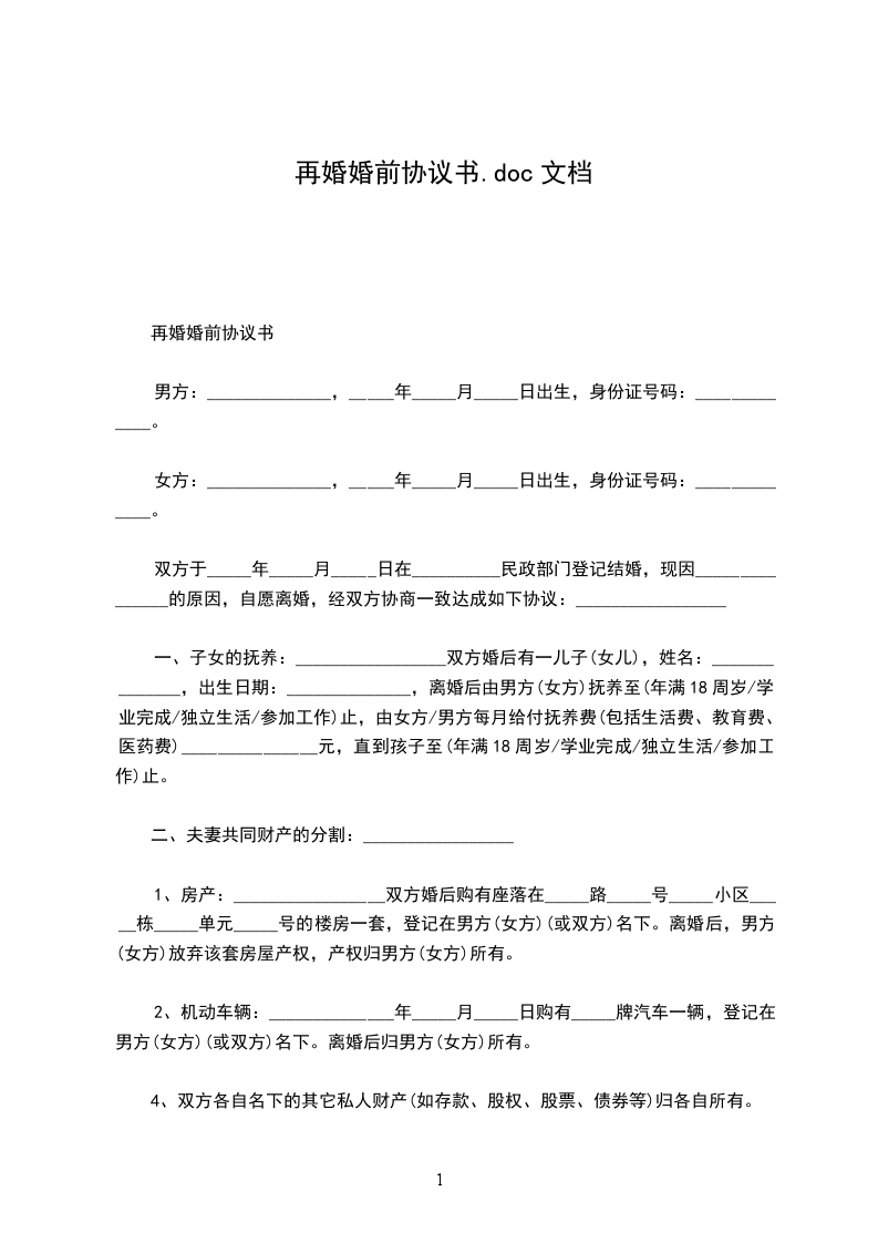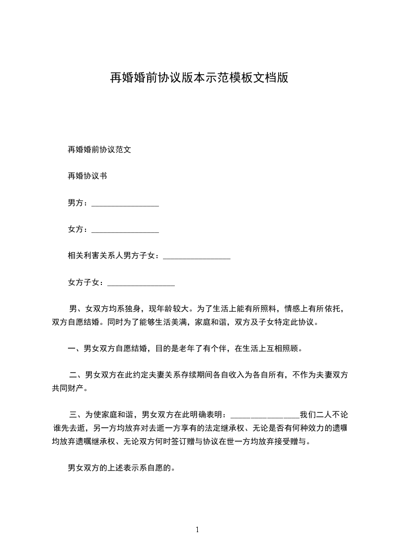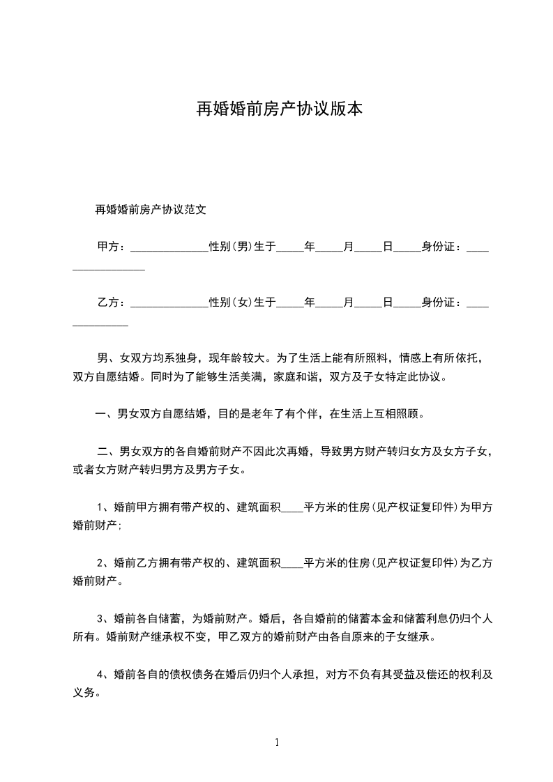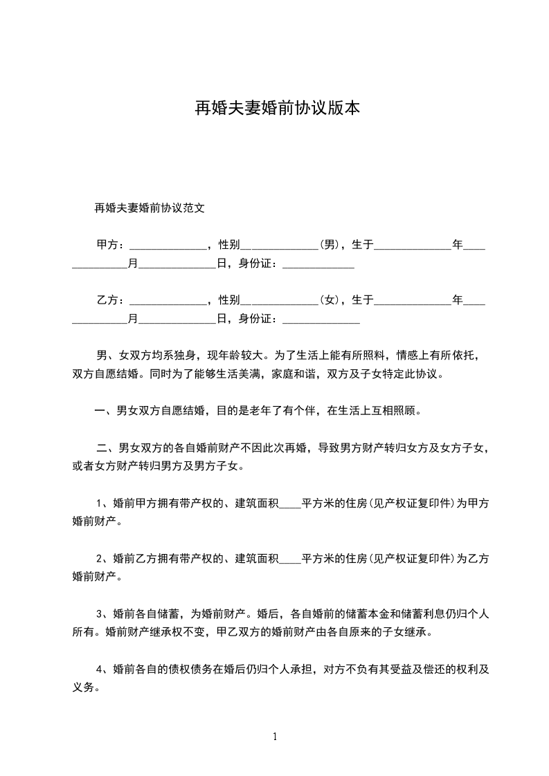 再婚婚前协议范文
