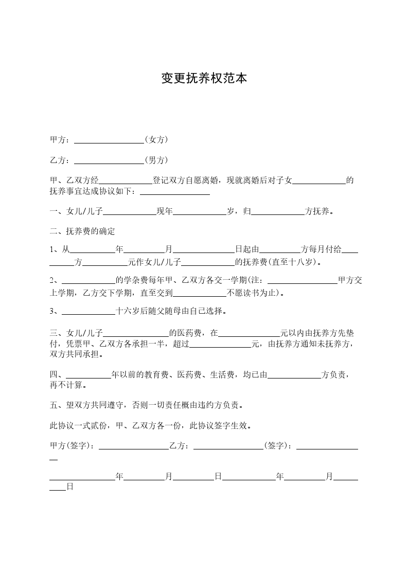 甲方(男方)________身份证号:____________住址:_______________乙方(女方)________身份证号:____________住址:_______________双方在平等、自愿的基础上,经过充分的协商,现就双方离婚后变更子女抚养权等相关事宜达成协议如下:一、女儿__自_____年_____月_____日起由女方__抚养,直至年满18周岁,其间负责其日常生活、健康和教育等方面的监护。二、被抚养人的抚养费及支付方式1、男方__则每年支付抚养费__元,不承担具体抚养工作。2、男方应于每年的12月1-5日前将儿子的抚养费汇至女方指定的银行账号。三、探视权1、男方对孩子_____享有探望权。2、探望时间及方式,没有抚养的一方每个月可以探望一次。3、探望之前,必须先经与女方电话联系。探望期间,要保证孩子的安全及身心健康、愉快。四、如遇其它未尽事宜或应时事宜,按照一切有利于孩子的原则,互谅互让,协商解决。五、本协议一式叁份,甲、乙双方各一份,一份交派出所办理孩子的户口迁移手续,户口迁移手续自本协议签订后三个月内办理完毕。六、本协议自双方签字后生效。甲方:____乙方:_________年_____月_____日_____年_____月_____日