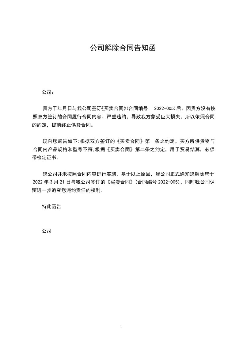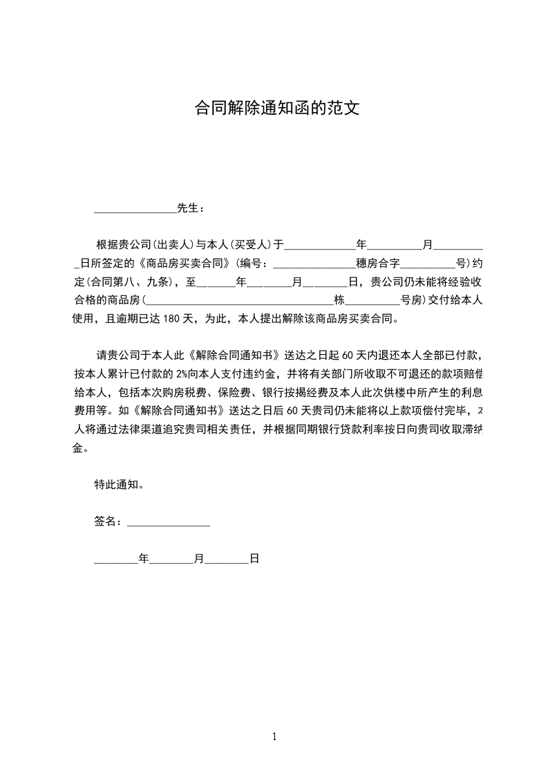 开发商房屋买卖合同解除通知函