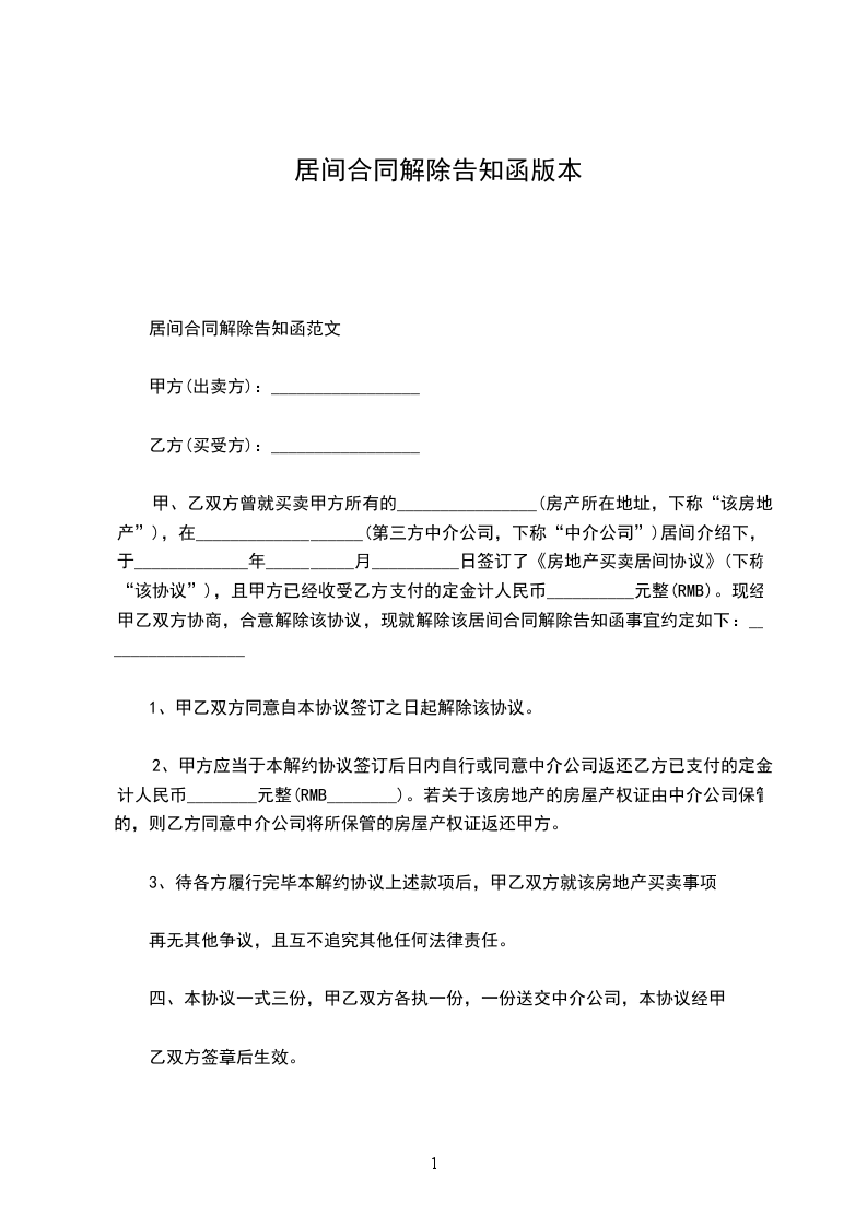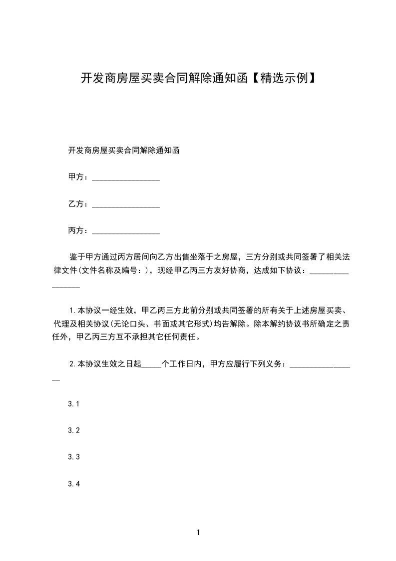 1.本协议一经生效,甲乙丙三方此前分别或共同签署的所有关于上述房屋买卖、代理及相关协议(无论口头、书面或其它形式)均告解除。除本解约协议书所确定之责任外,甲乙丙三方互不承担其它任何责任。