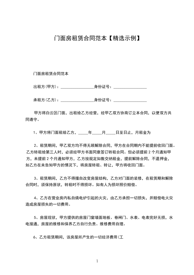 1、甲方将门面租给乙方,_____年_____月_____日至日止,月租金为