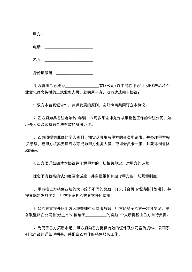 甲方聘用乙方成为_________________有限公司(以下简称甲方)系列化产品及企业文化理念传播的正式业务人员,就聘用事宜,双方达成如下协议: