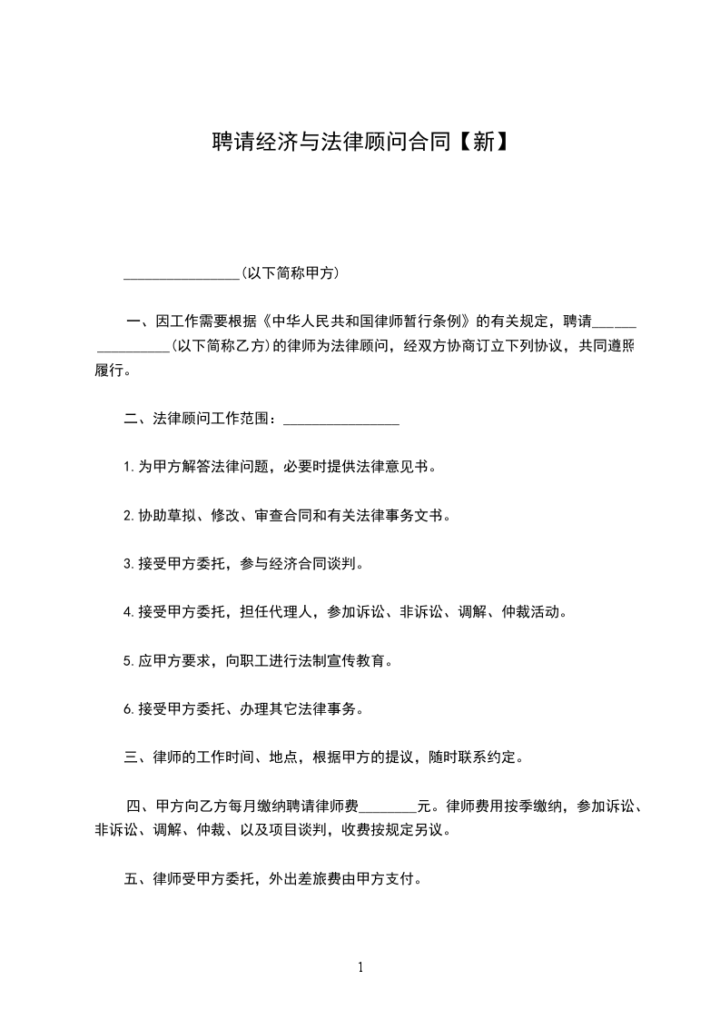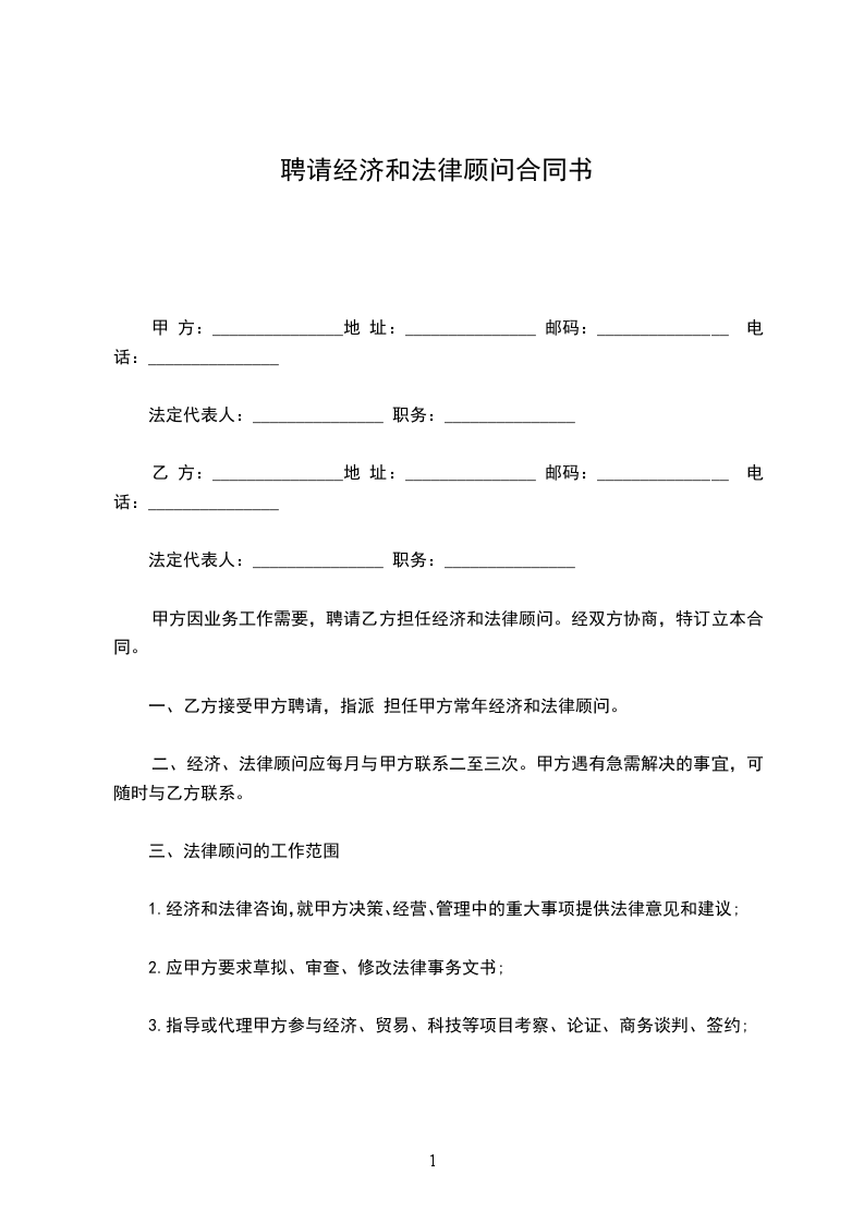 一、乙方接受甲方聘请,指派____________________担任甲方常年经济和法律顾问。