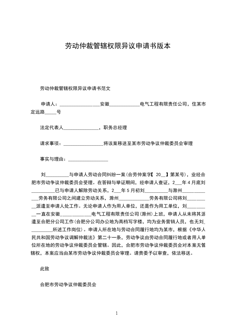 刘__________与申请人劳动合同纠纷一案(合劳仲案字【20__】第某号),业经合肥市劳动争议仲裁委员会受理。在答辩与举证期间,经申请人查证,2___年4月底刘__________已与申请人解除劳动关系,2___年5月初刘__________与滁州_____________劳务有限公司之间建立劳动关系,滁州_____________劳务有限公司将刘__________派遣至申请人处工作。无论申请人作为用人单位,还是作为用工单位,刘__________一直在安徽_____________电气工程有限责任公司(滁州)上班,申请人从未将其派遣至合肥分公司工作(合肥分公司办公地为高档写字楼,均为业务营销人员,也无刘__________所述工作岗位)。申请人所在地与劳动合同履行地均为某市,根据《中华人民共和国劳动争议调解仲裁法》第二十一条,劳动争议由劳动合同履行地或者用人单位所在地的劳动争议仲裁委员会管辖。因此,合肥市劳动争议仲裁委员会对本案无管辖权,本案应当由某市劳动争议仲裁委员会审理。请贵委予以审查,依法移送。