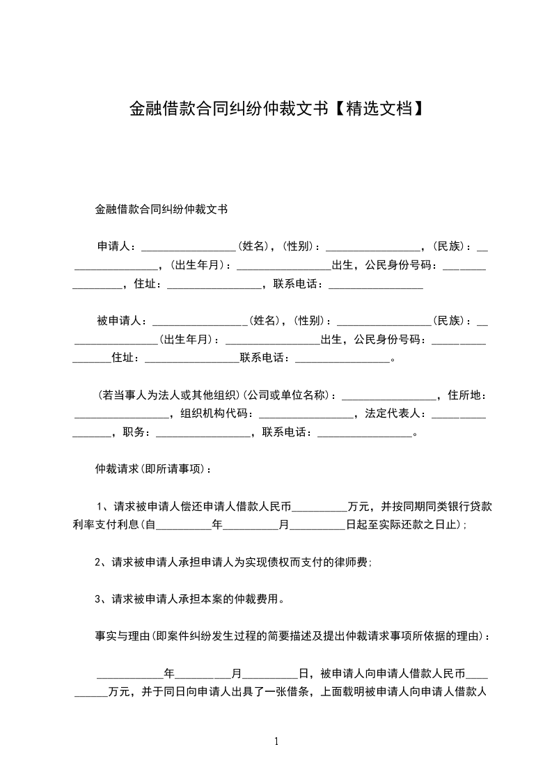 金融借款仲裁申请书范文