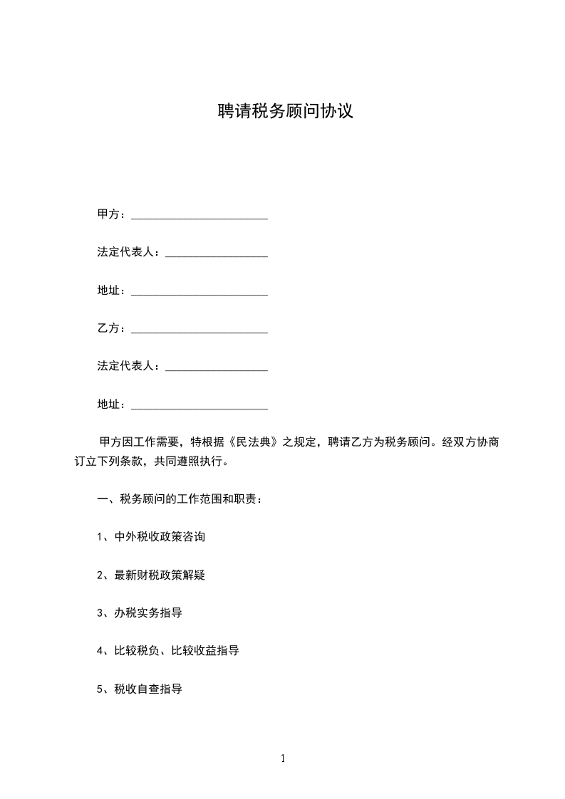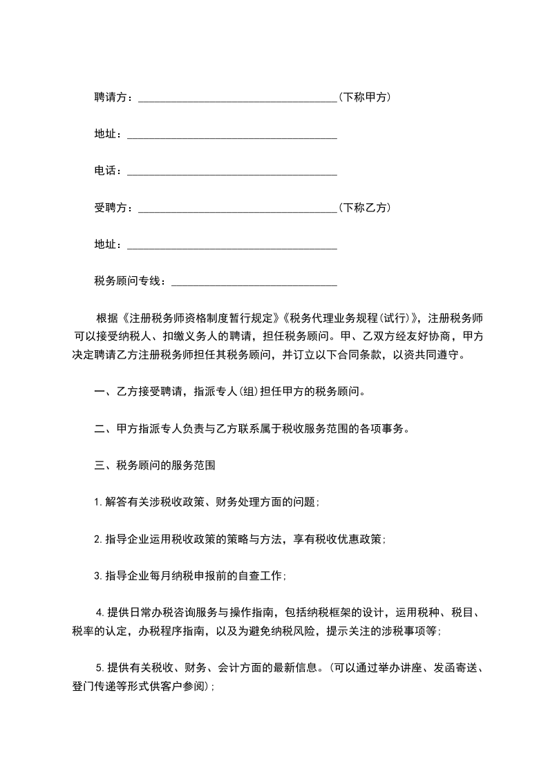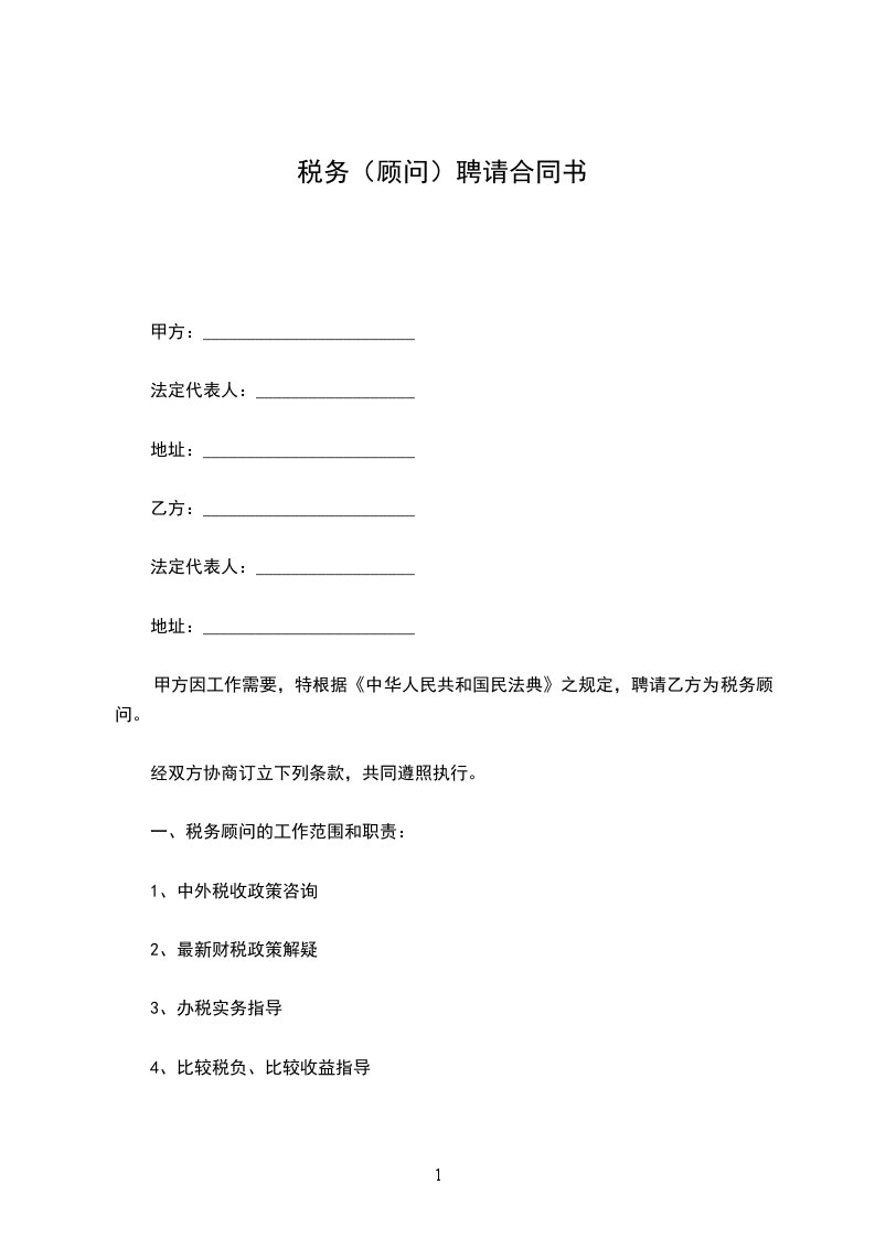甲方因工作需要,特根据《中华人民共和国民法典》之规定,聘请乙方为税务顾问。经双方协商订立下列条款,共同遵照执行。