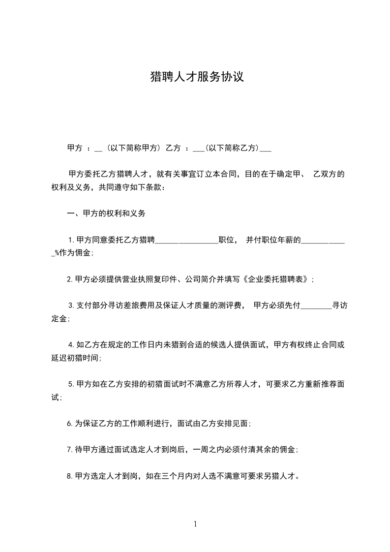 甲乙双方就甲方向乙方提供人才猎头服务,达成如下协议: