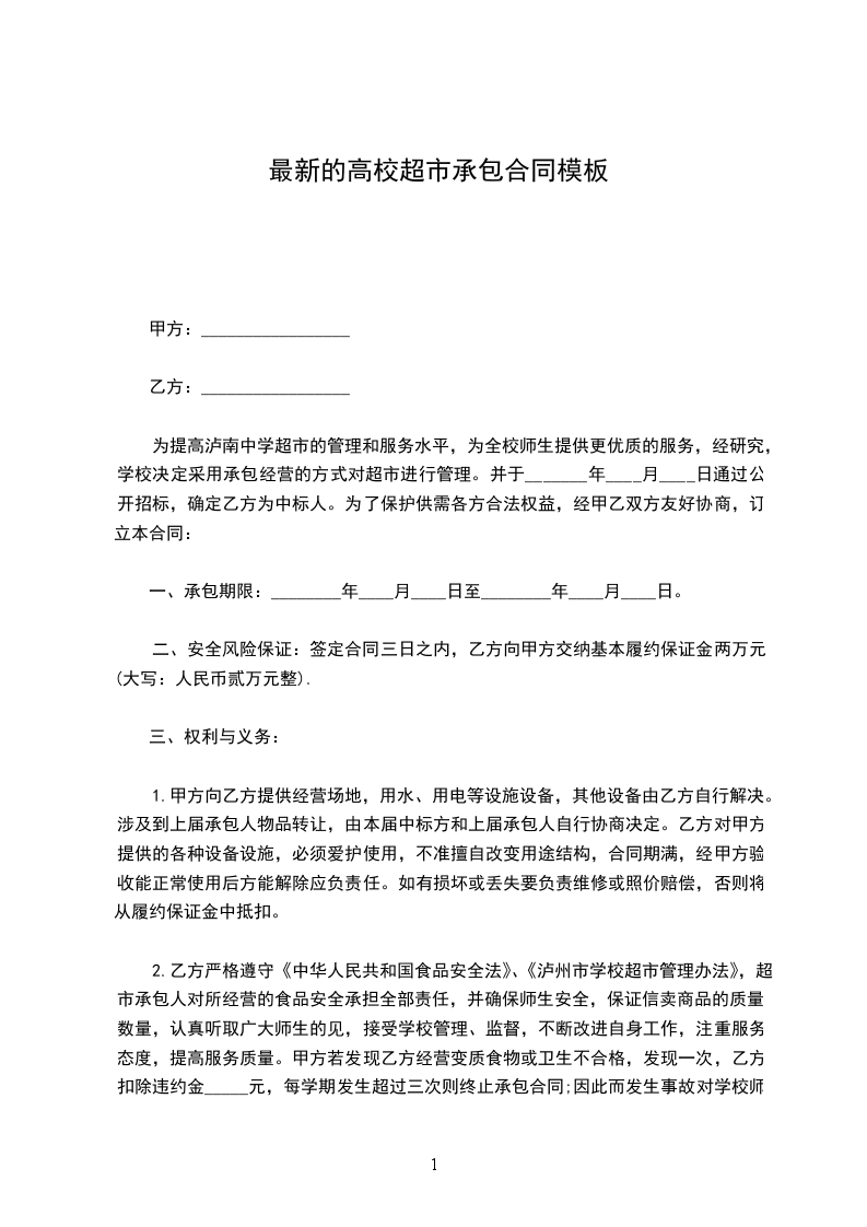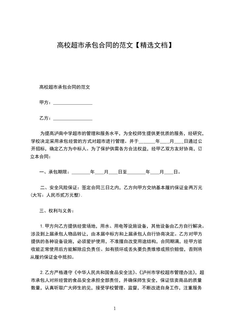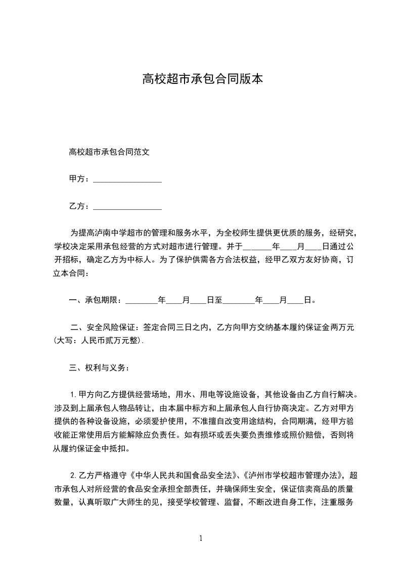 为提高泸南中学超市的管理和服务水平,为全校师生提供更优质的服务,经研究,学校决定采用承包经营的方式对超市进行管理。并于_______年____月____日通过公开招标,确定乙方为中标人。为了保护供需各方合法权益,经甲乙双方友好协商,订立本合同:
