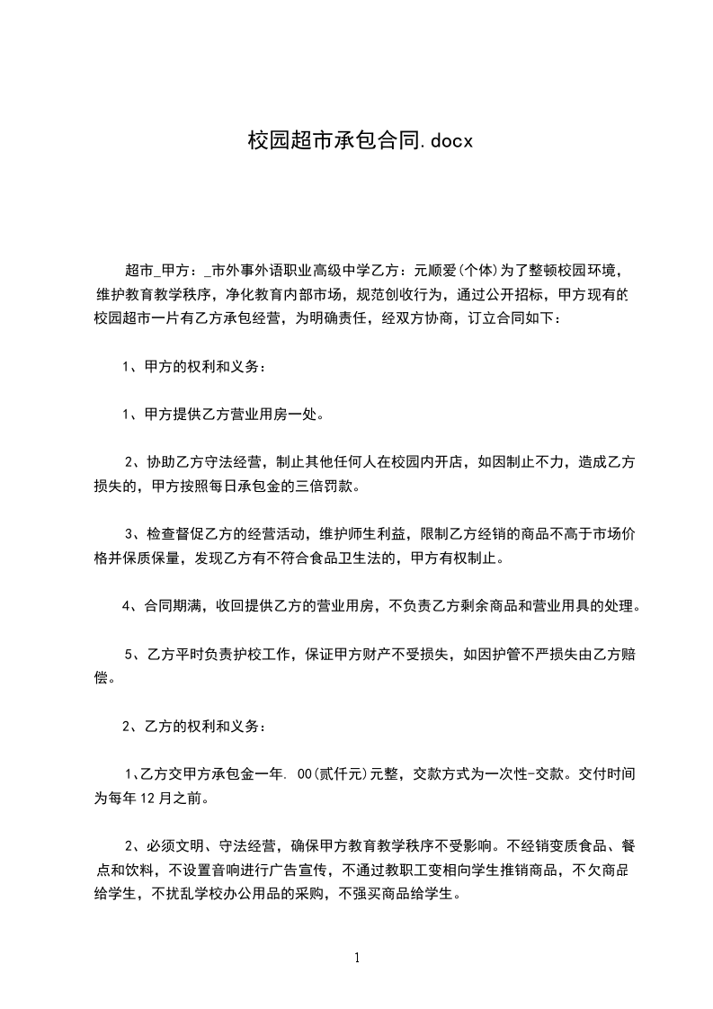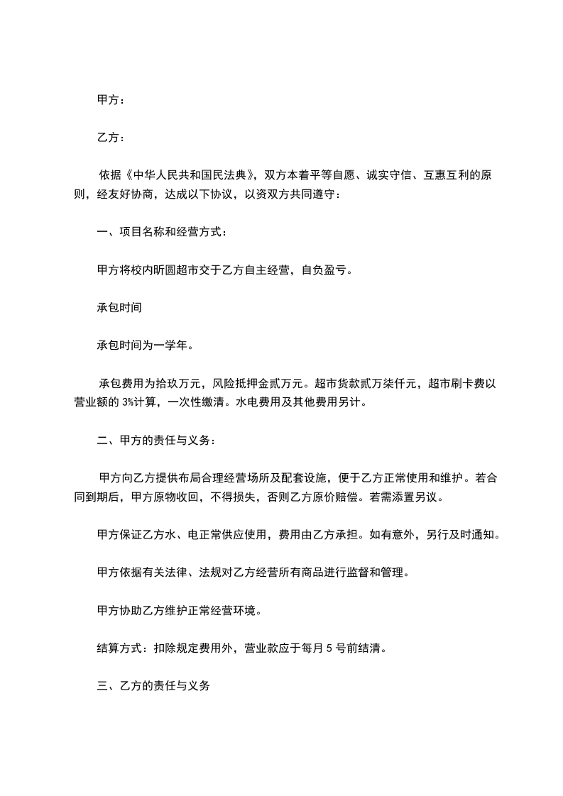 超市经营范围:学习用具、小百货、食品(面包,牛奶、瓶装水、烤肠、小吃)等。要求销售价格低于社会市场超市价格5%以上。不准经营食堂经营的食品,不准卖烟酒,不准擅自增加经营项目。一经发现乙方上述违规经营,甲方处以乙方:发现第一次扣除违约金500元,每学期发生超过三次违规经营则终止承包合同并取消承包资格。