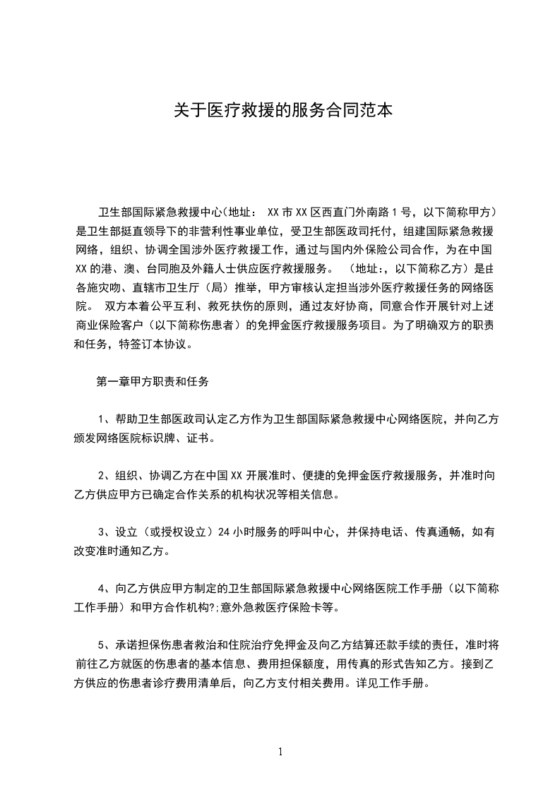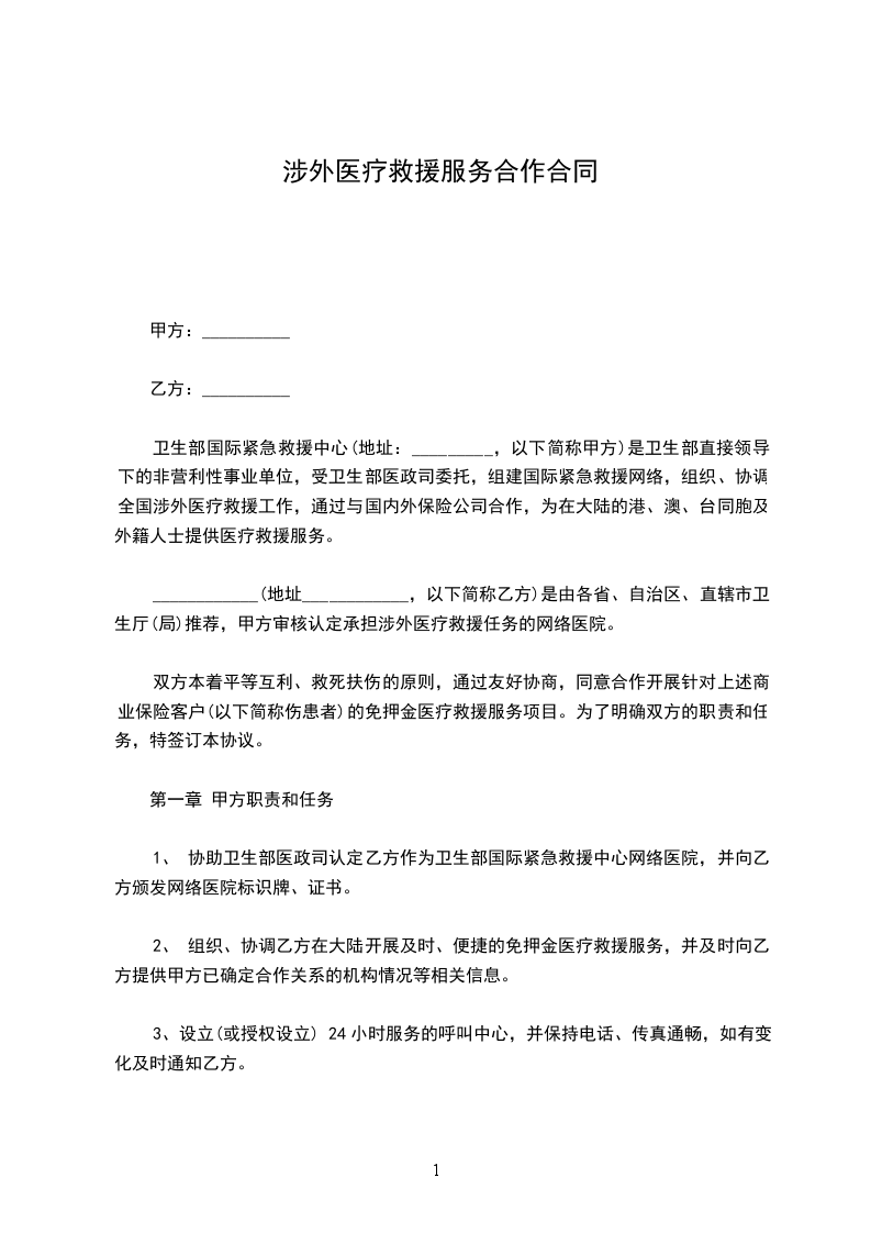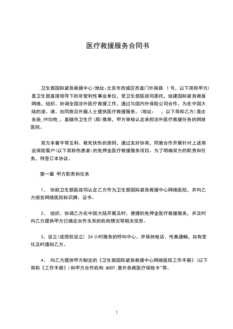 卫生部国际紧急救援中心(地址:北京市西城区西直门外南路1号,以下简称甲方)是卫生部直接领导下的非营利性事业单位,受卫生部医政司委托,组建国际紧急救援网络,组织、协调全国涉外医疗救援工作,通过与国内外保险公司合作,为在中国大陆的港、澳、台同胞及外籍人士提供医疗救援服务。(地址: ,以下简称乙方)是由各施_⒆灾吻_、直辖市卫生厅(局)推荐,甲方审核认定承担涉外医疗救援任务的网络医院。