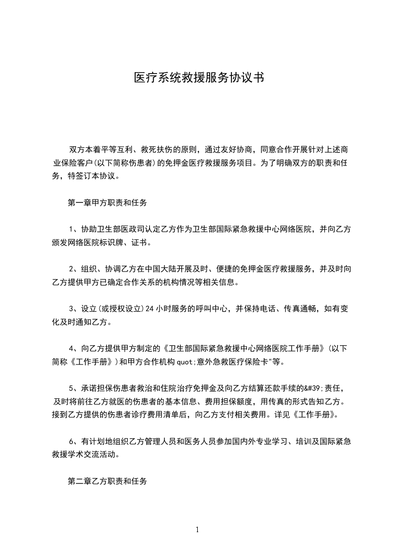 双方本着平等互利、救死扶伤的原则,通过友好协商,同意合作开展针对上述商业保险客户(以下简称伤患者)的免押金医疗救援服务项目。为了明确双方的职责和任务,特签订本协议。