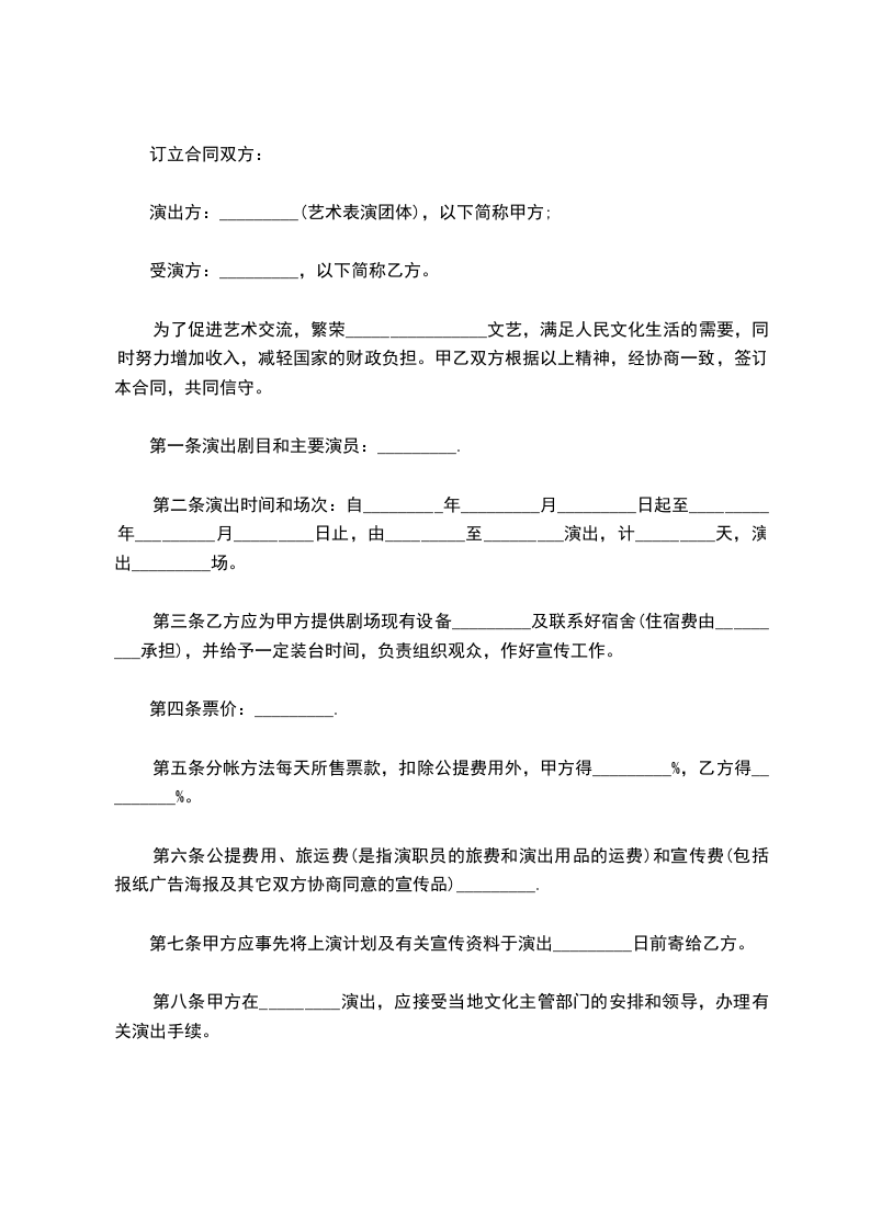 第二条 演出时间和场次自__年__月__日起至__年__月__日止,由__至__演出,计__天,演出__场。