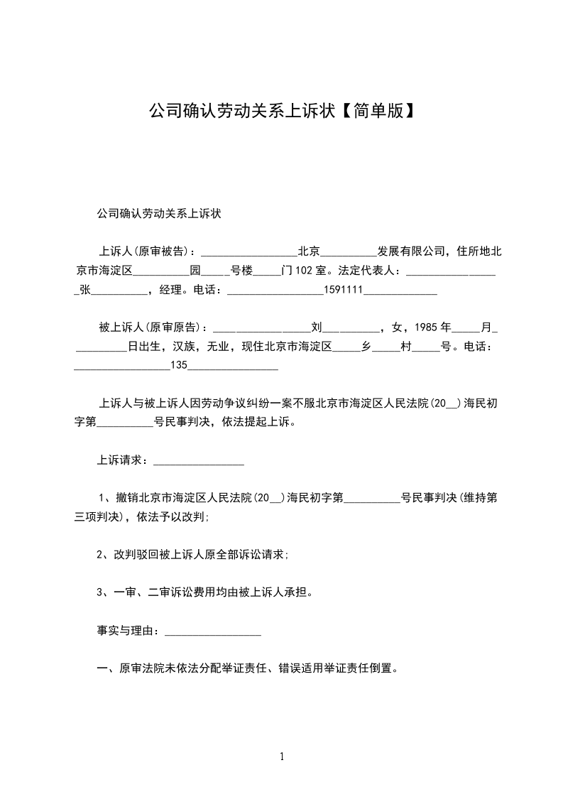 公司确认劳动关系上诉状