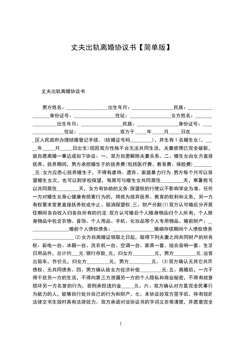 丈夫出轨离婚协议书