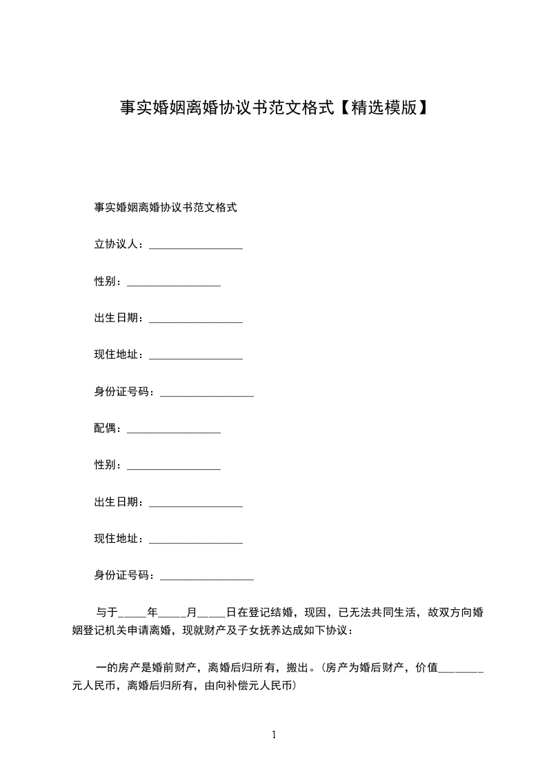 事实婚姻离婚协议书范文格式
