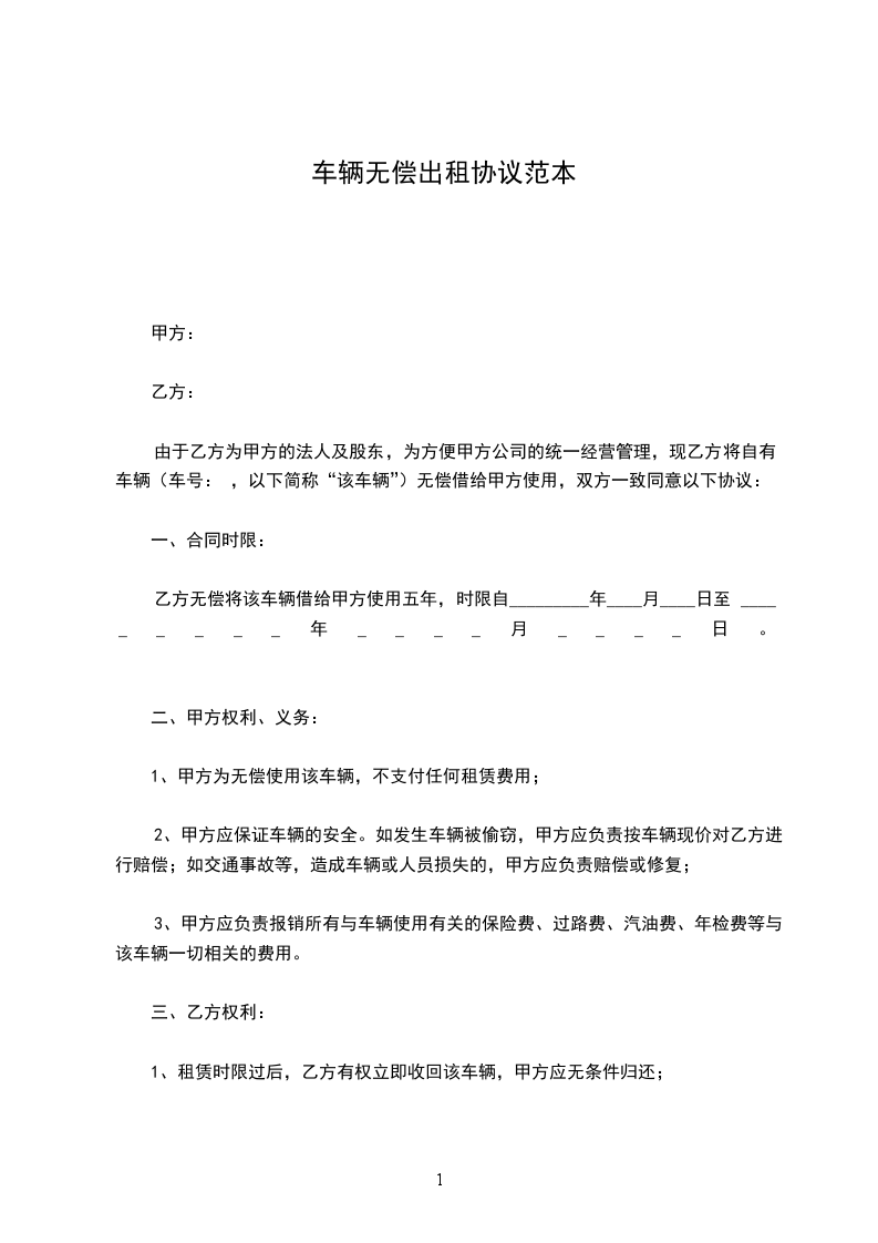 由于乙方为甲方的法人及股东,为方便甲方公司的统一经营管理,现乙方将自有车辆(车号: ,以下简称“该车辆”)无偿借给甲方使用,双方一致同意以下协议: