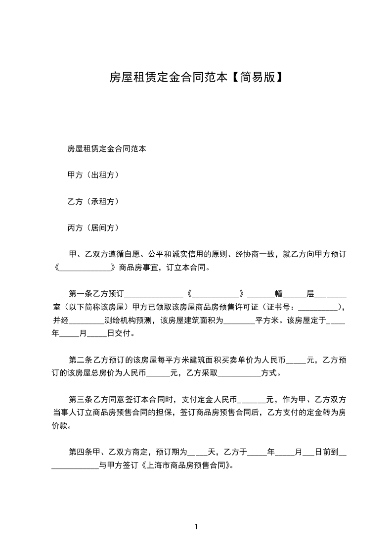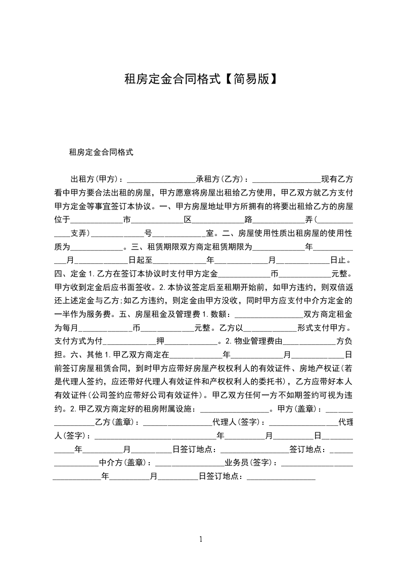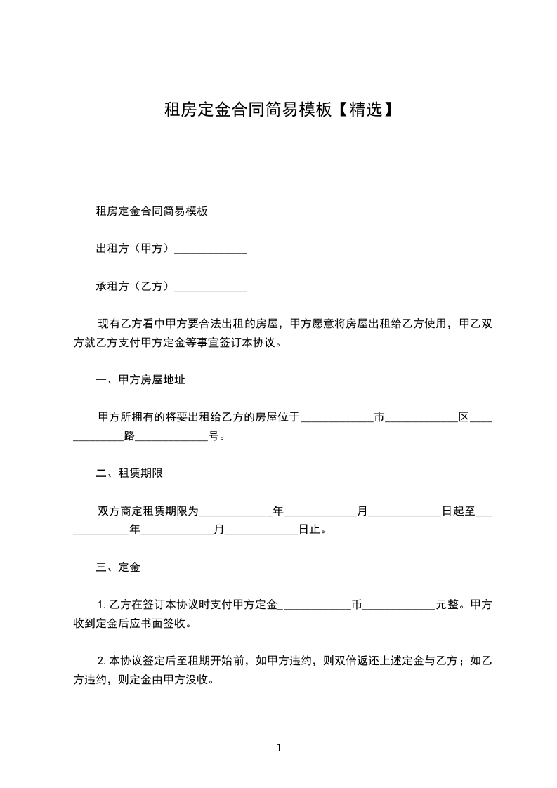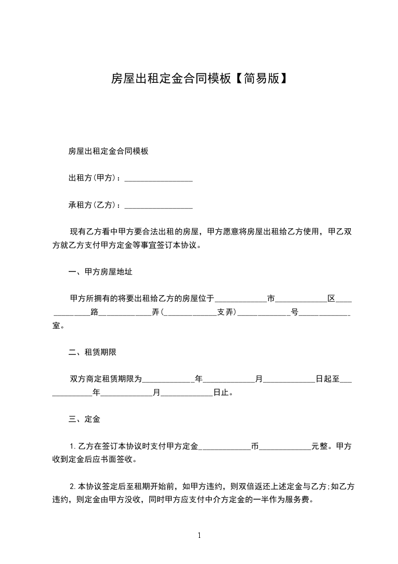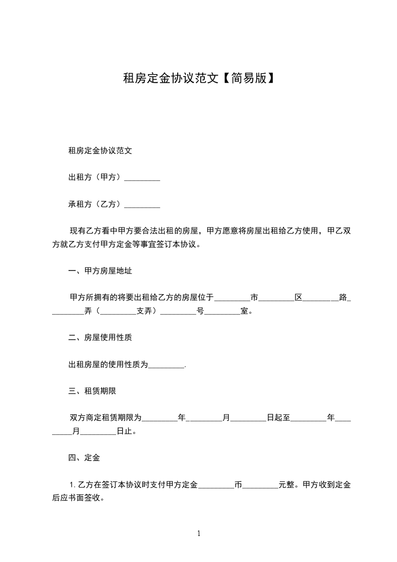 1.乙方在签订本协议时支付甲方定金____________元整。甲方收到定金后应书面签收。