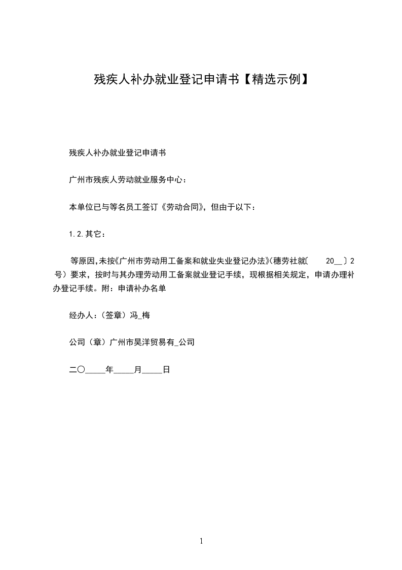 等原因,未按《广州市劳动用工备案和就业失业登记办法》(穗劳社就〔20__〕2号)要求,按时与其办理劳动用工备案就业登记手续,现根据相关规定,申请办理补办登记手续。附:申请补办名单