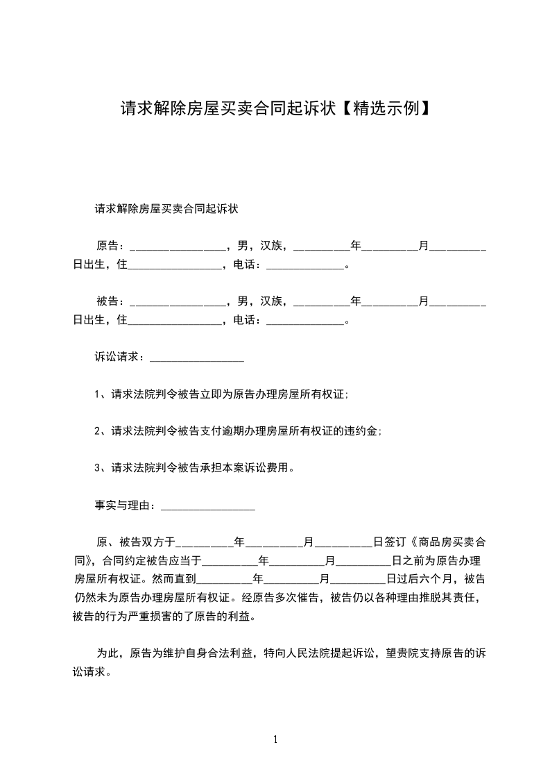 请求解除房屋买卖合同起诉状
