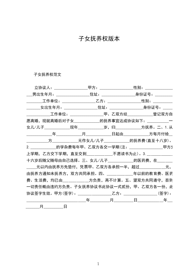 立协议人:_________________甲方:_________________性别:_________________男出生年月:_________________住址:_________________身份证号:_________________工作单位:_________________乙方:_________________性别:_________________女出生年月:_________________住址:_________________身份证号:_________________工作单位:_________________甲、乙双方经_____________登记双方自愿离婚,现就离婚后对子女_____________的抚养事宜达成协议如下:___________一、女儿/儿子_____________现年_____________岁,归_____________方抚养。二、1.从_____________年_____________月_____________日起由_____________方每月付给_____________方_____________元作女儿/儿子_____________的抚养费(直至十八岁)。2._____________的学杂费每年甲、乙双方各交一学期(注:_________________甲方交上学期,乙方交下学期,直至交到_____________不愿读书为止)。3._____________十六岁后随父随母由自己选择。三、女儿/儿子_____________的医药费,在_____________元以内由抚养方先垫付,凭票甲、乙双方各承担一半,超过_____________元,由抚养方通知未抚养方,双方共同承担。四、_____________年以前的教育费、医药费、生活费,均已由_____________方负责,再不计算。五、望双方共同遵守,否则一切责任概由违约方负责。子女抚养协议书此协议一式贰份,甲、乙双方各一份,此协议签字生效。甲方(签字):_________________乙方:_________________(签字):______________________________年__________月__________日_____________年__________月__________日