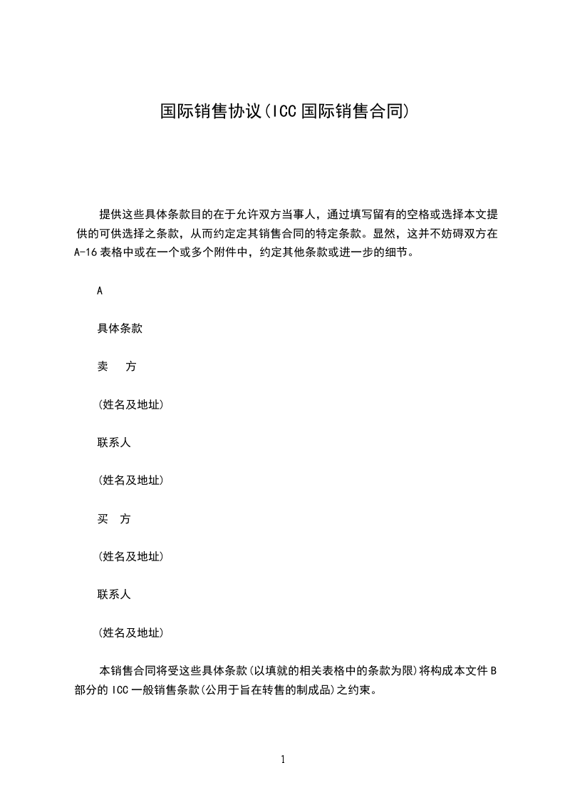 本销售合同将受这些具体条款(以填就的相关表格中的条款为限)将构成本文件B部分的ICC一般销售条款(公用于旨在转售的制成品)之约束。