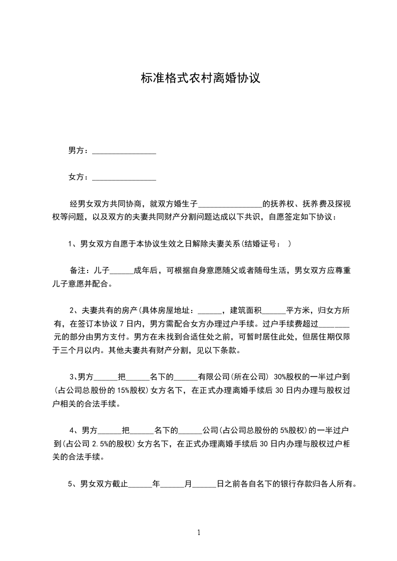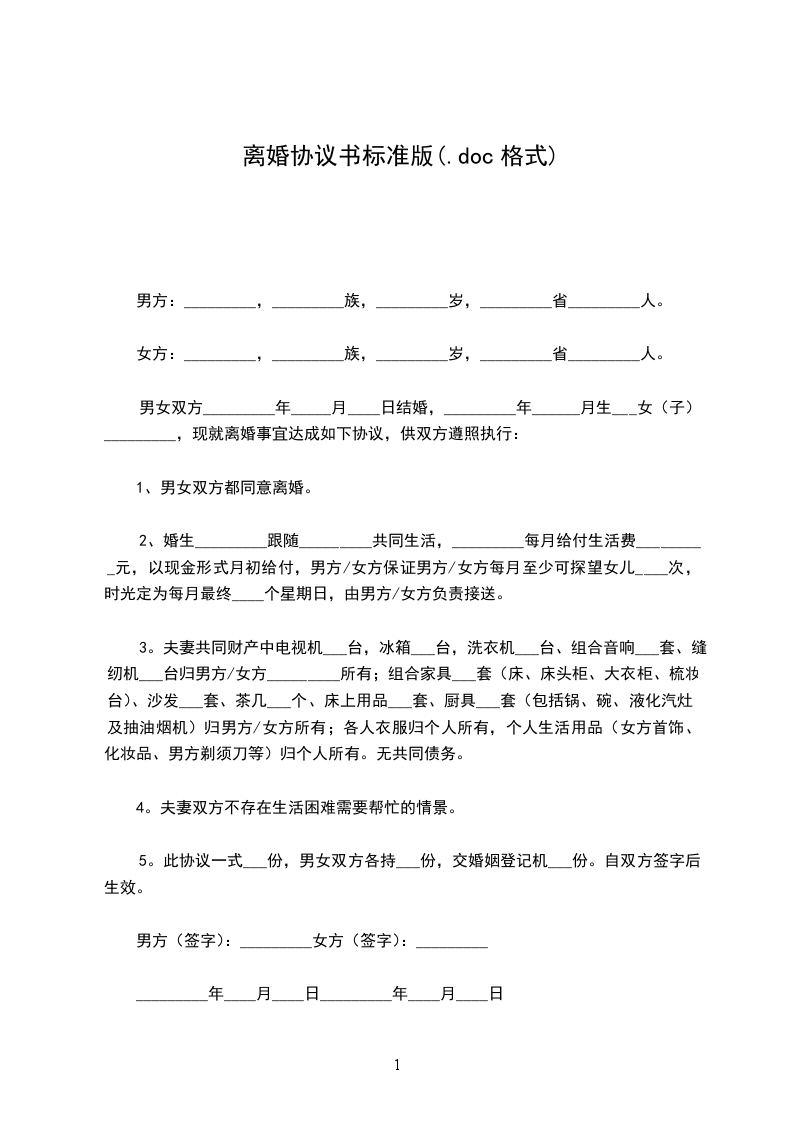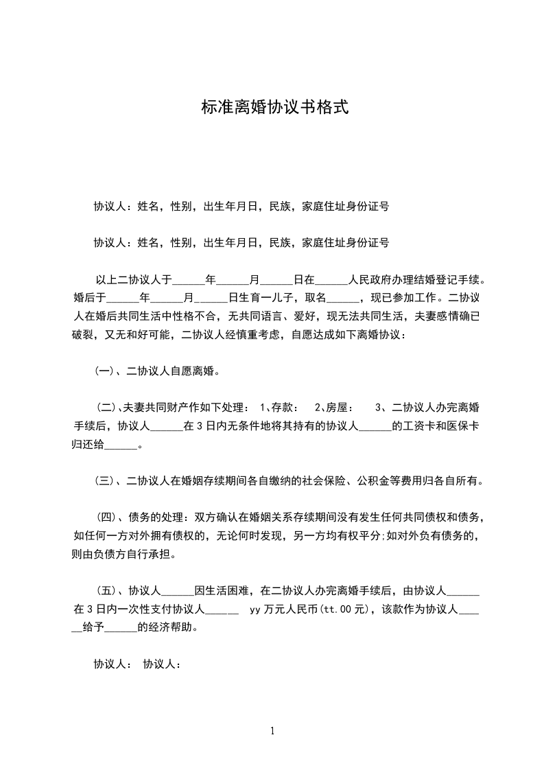 女方:______________,_____年_____月_____日出生,身份证号码:_____________。双方于_____年_____月_____日在__________民政部门登记结婚,现因_______________的原因,自愿离婚,经双方协商达成如下协议:_________________