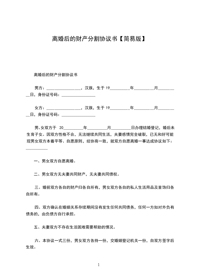 男、女双方于20__________年__________月__________日办理结婚登记,婚后未生育子女。因双方性格不合,无法继续共同生活,夫妻感情完全破裂,已无和好可能。现男女双方本着平等、自愿原则,经协商一致,就双方自愿离婚一事达成协议如下:___________
