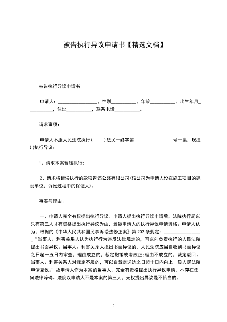 申请人不服人民法院执行(_____)法民一终字第_________________号一案,现提出执行异议: