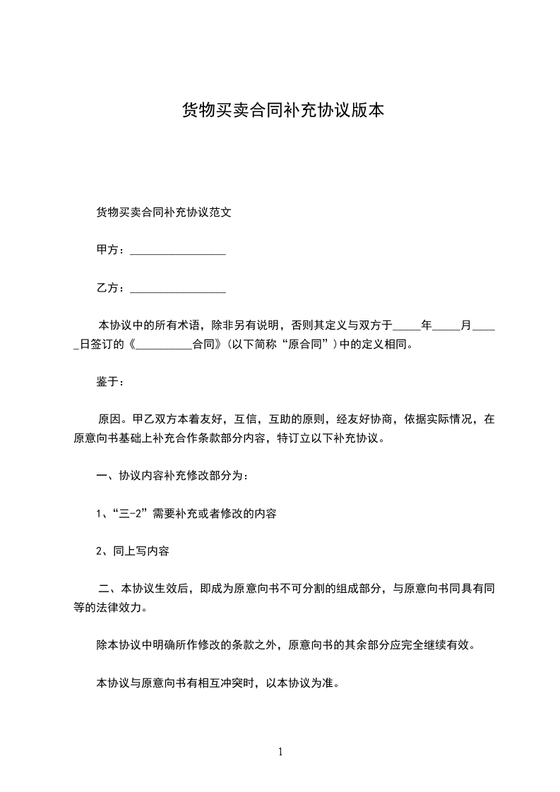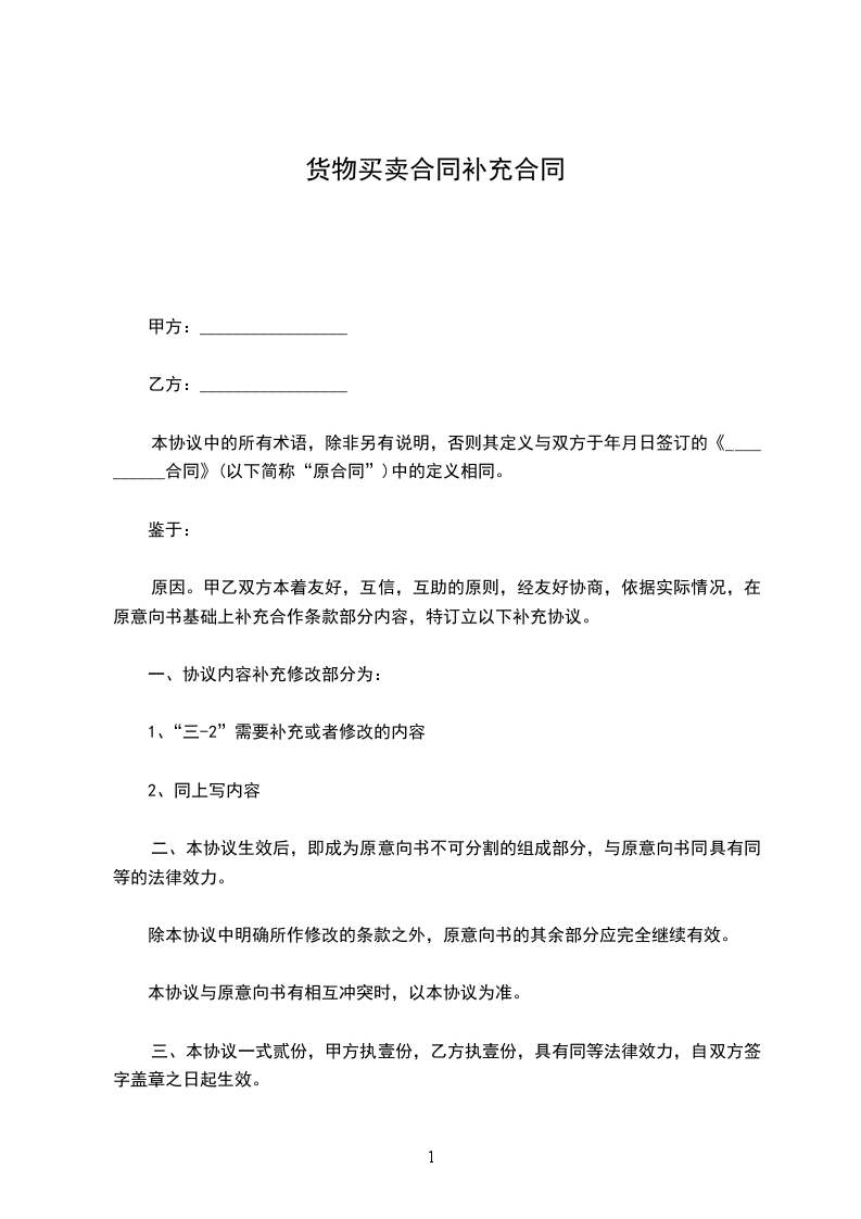 货物买卖合同补充协议范文