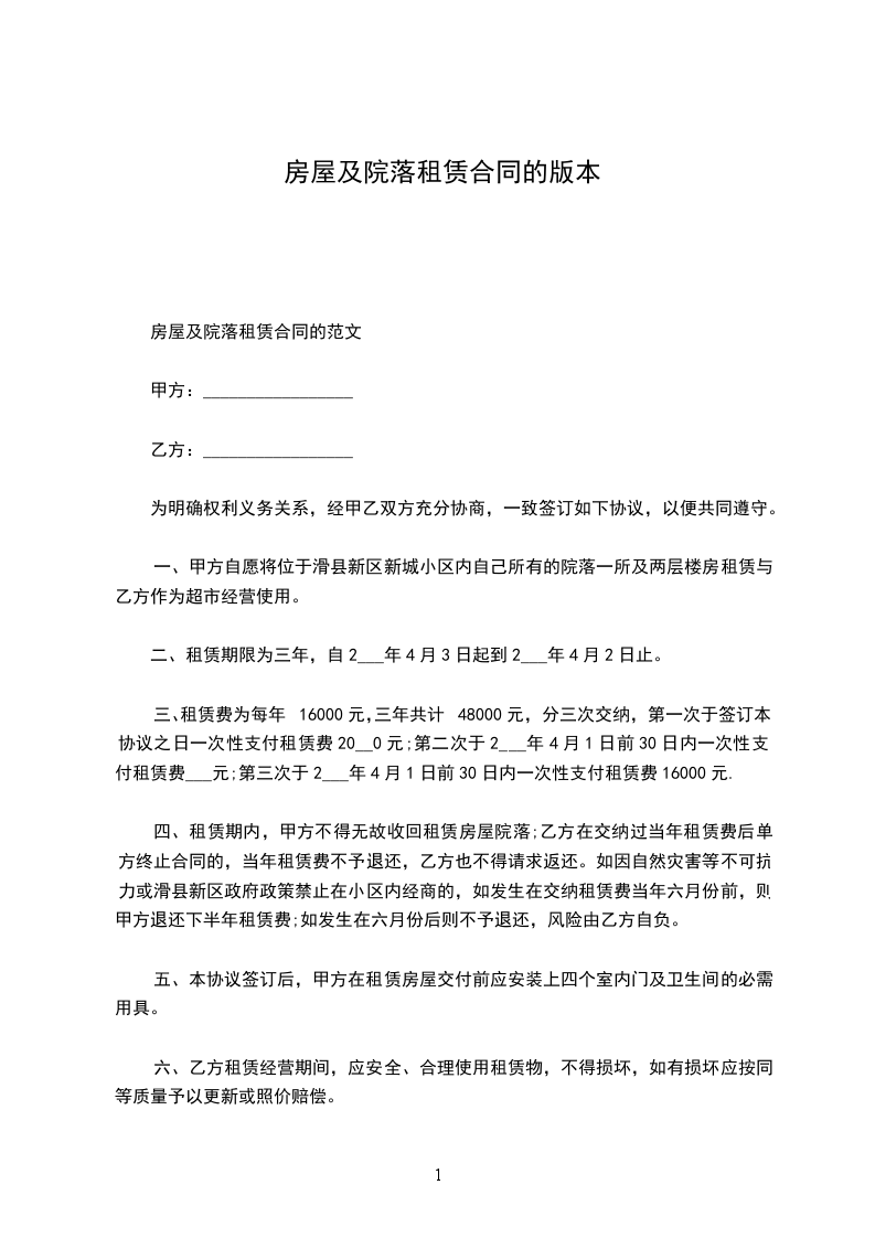 一、甲方自愿将位于滑县新区新城小区内自己所有的院落一所及两层楼房租赁与乙方作为超市经营使用。