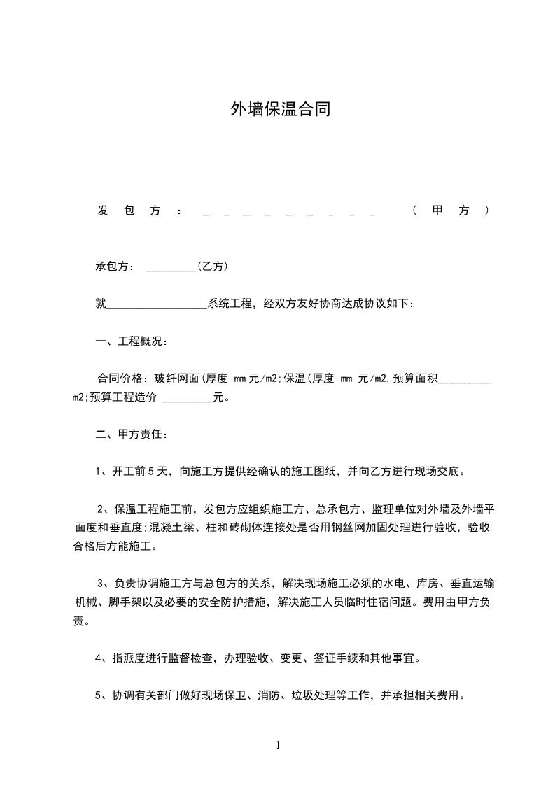 1、乙方承包甲方外墙内保温系统项目施工,承包价按人民币元/平方(按实际展开面积计算)